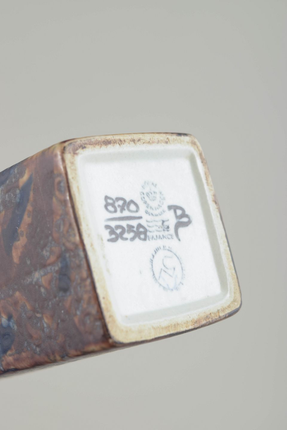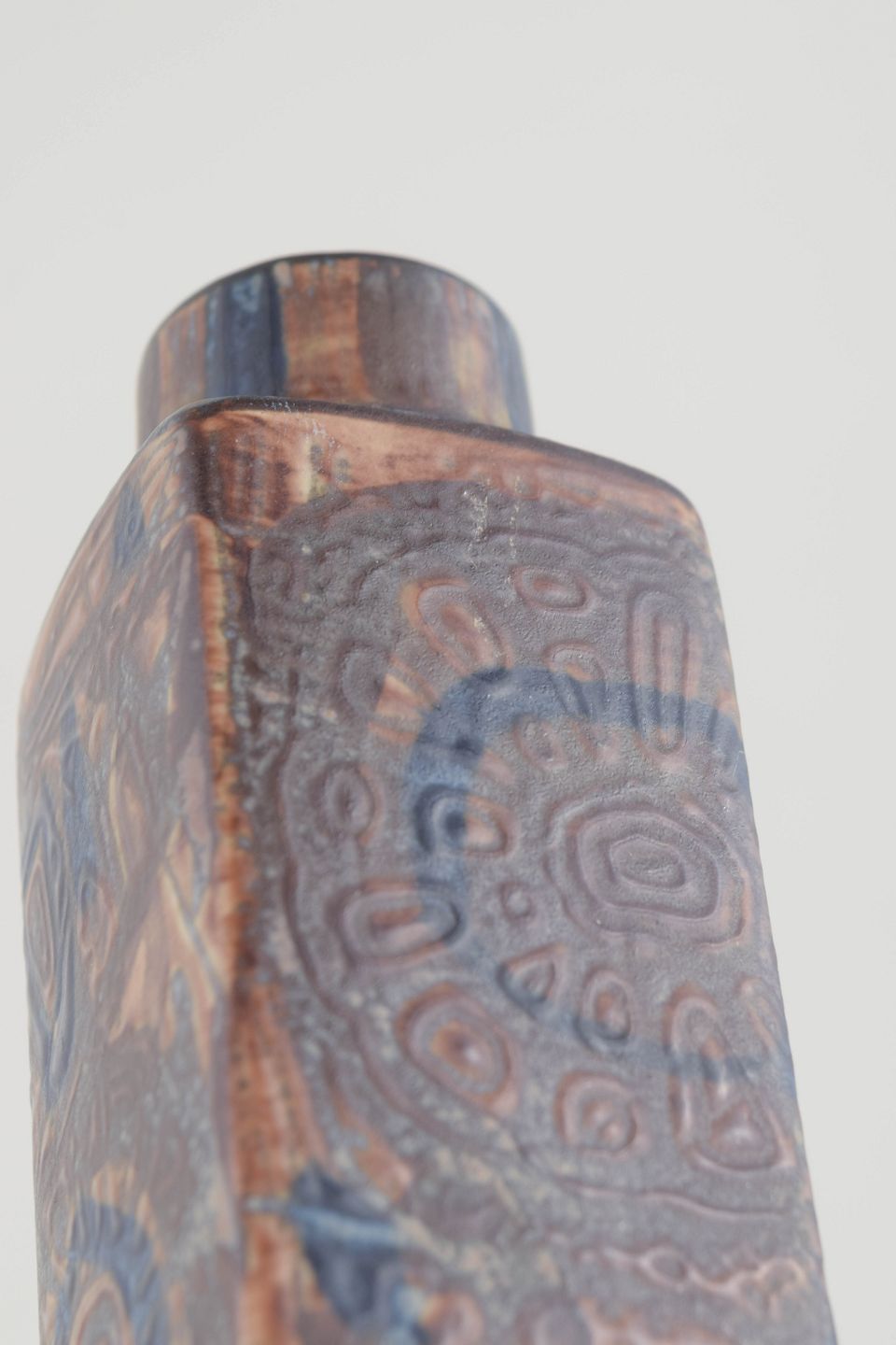 Rectangular stoneware vase with characteristic relief decoration in blue and brown hues from Thorsson’s Baca series. The geometric form combined with the organic pattern creates a striking and distinctly Danish modern expression.