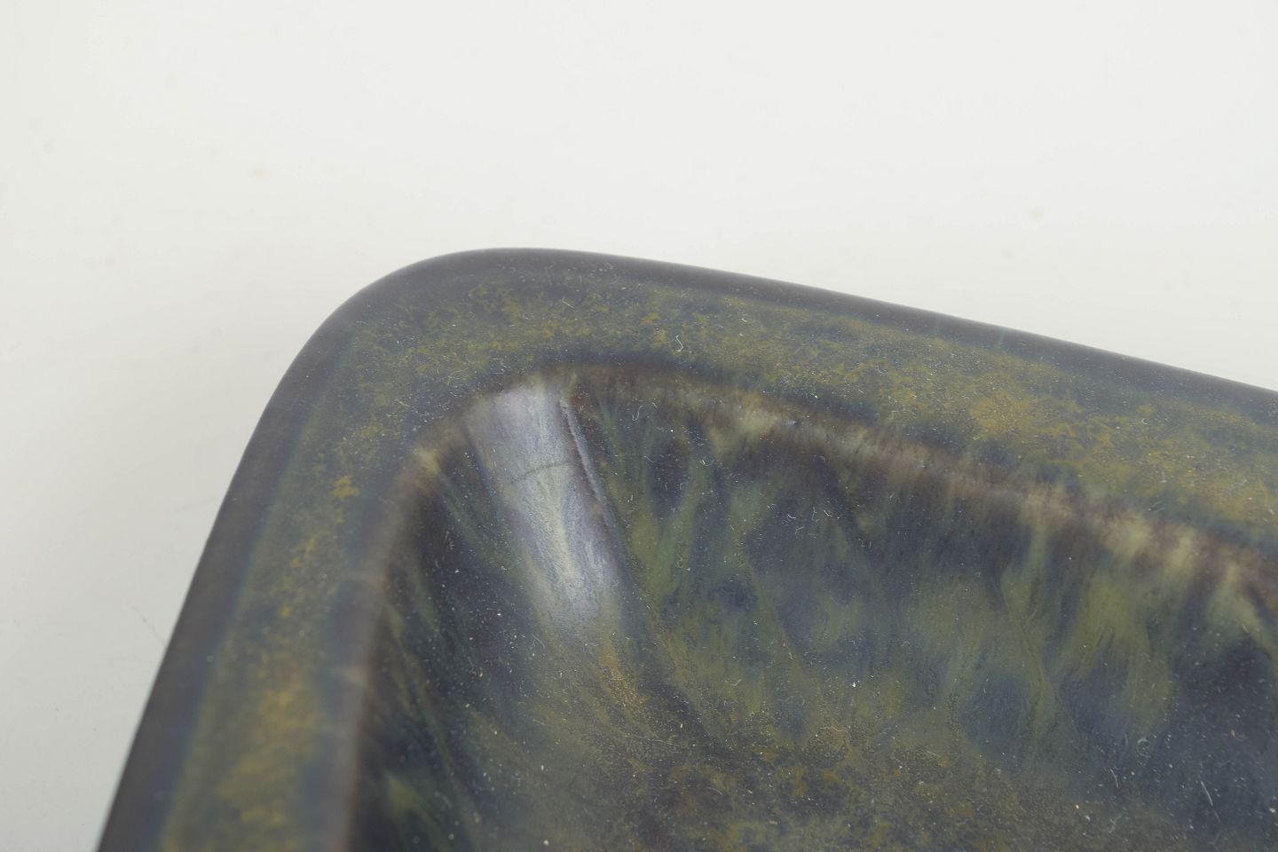Low rectangular stoneware bowl with a green glaze showing tonal shifts from olive to darker shades.