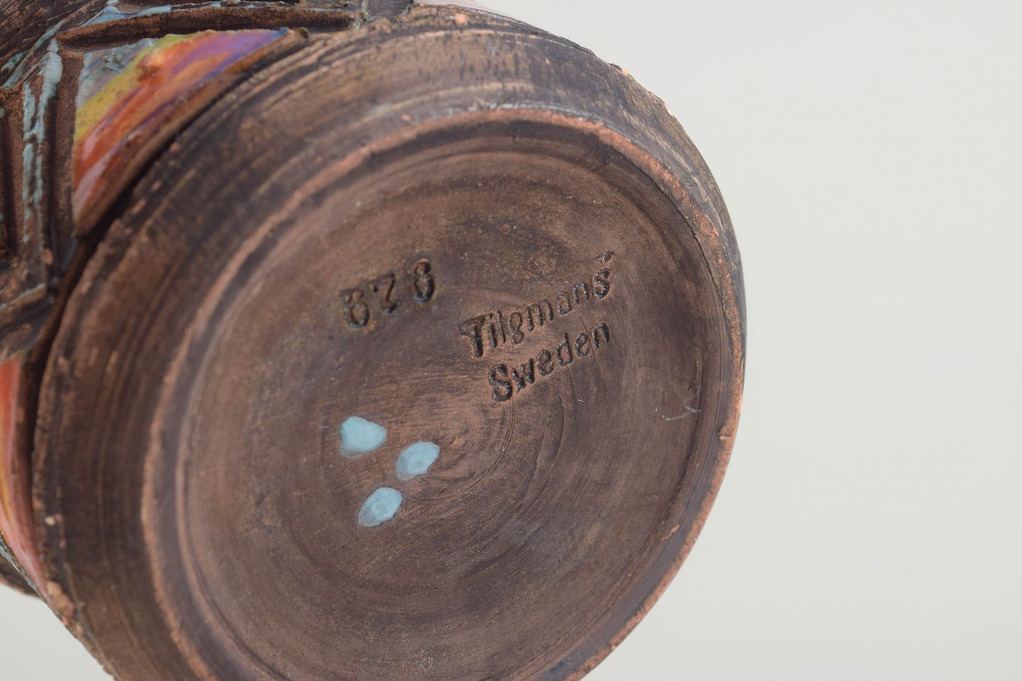 Tilgmans Keramik of Gothenburg was founded in the 1940s and became renowned for its decorative vases featuring coarse chamotte textures and glaze experiments inspired by international modernism. The interplay of matte and glossy surfaces, combined with geometric reliefs, makes Tilgmans’ pieces highly collectible examples of Swedish mid-century ceramics.