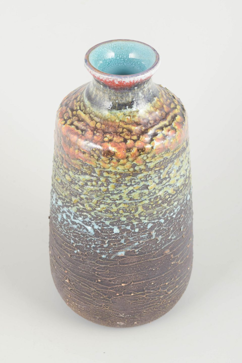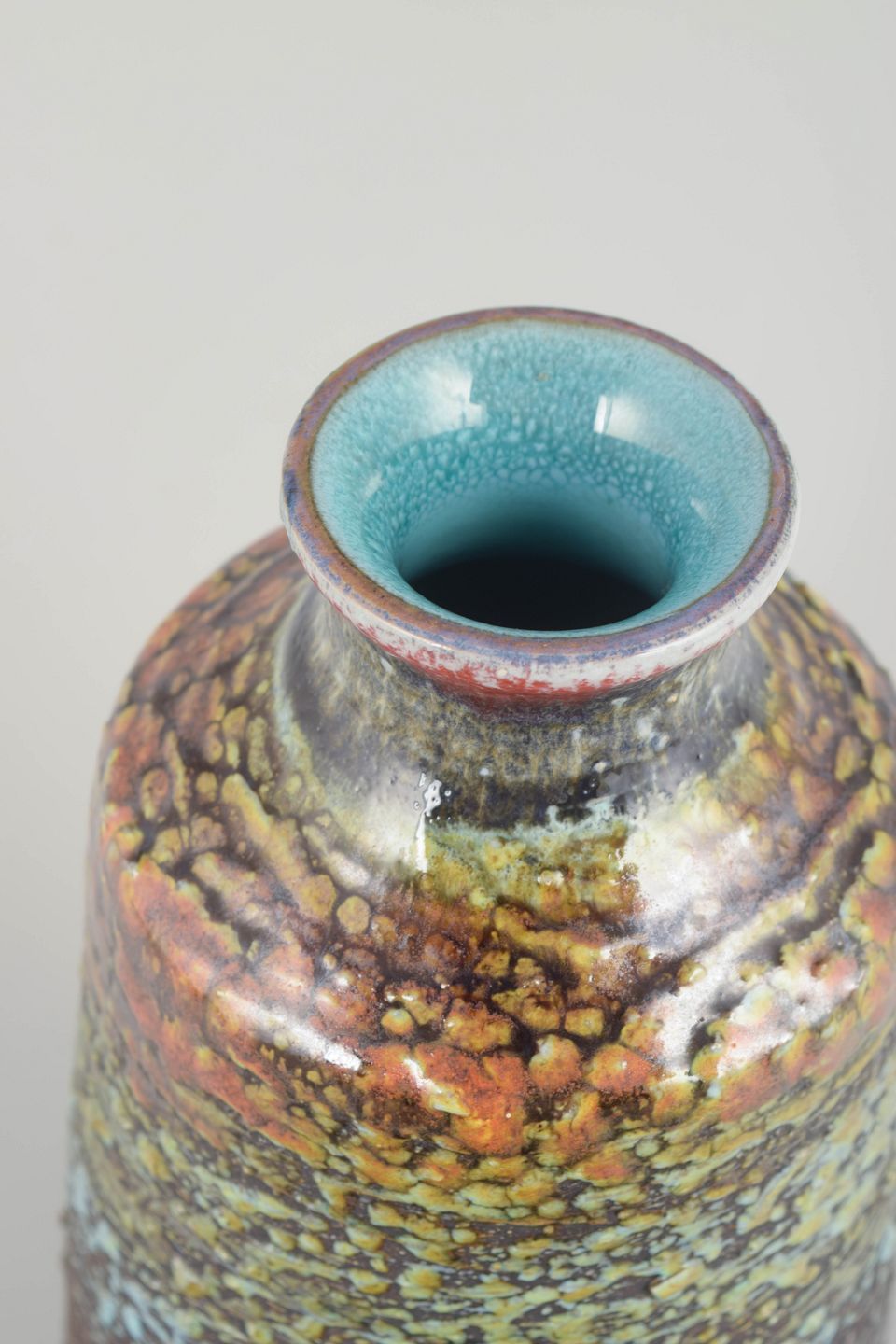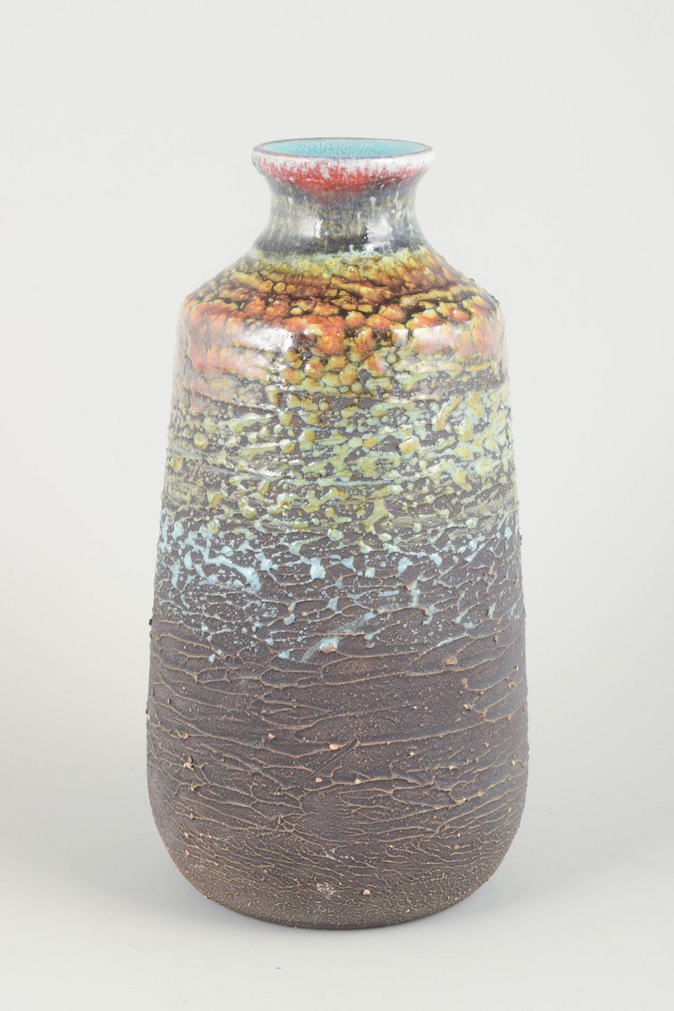 Large handmade vase in chamotte clay with characteristic volcanic glaze in multicoloured tones of brown, green, blue and red. The strong texture and fluid colour transitions give the piece a vivid and organic expression, typical of Tilgmans’ experimental ceramics from the period.