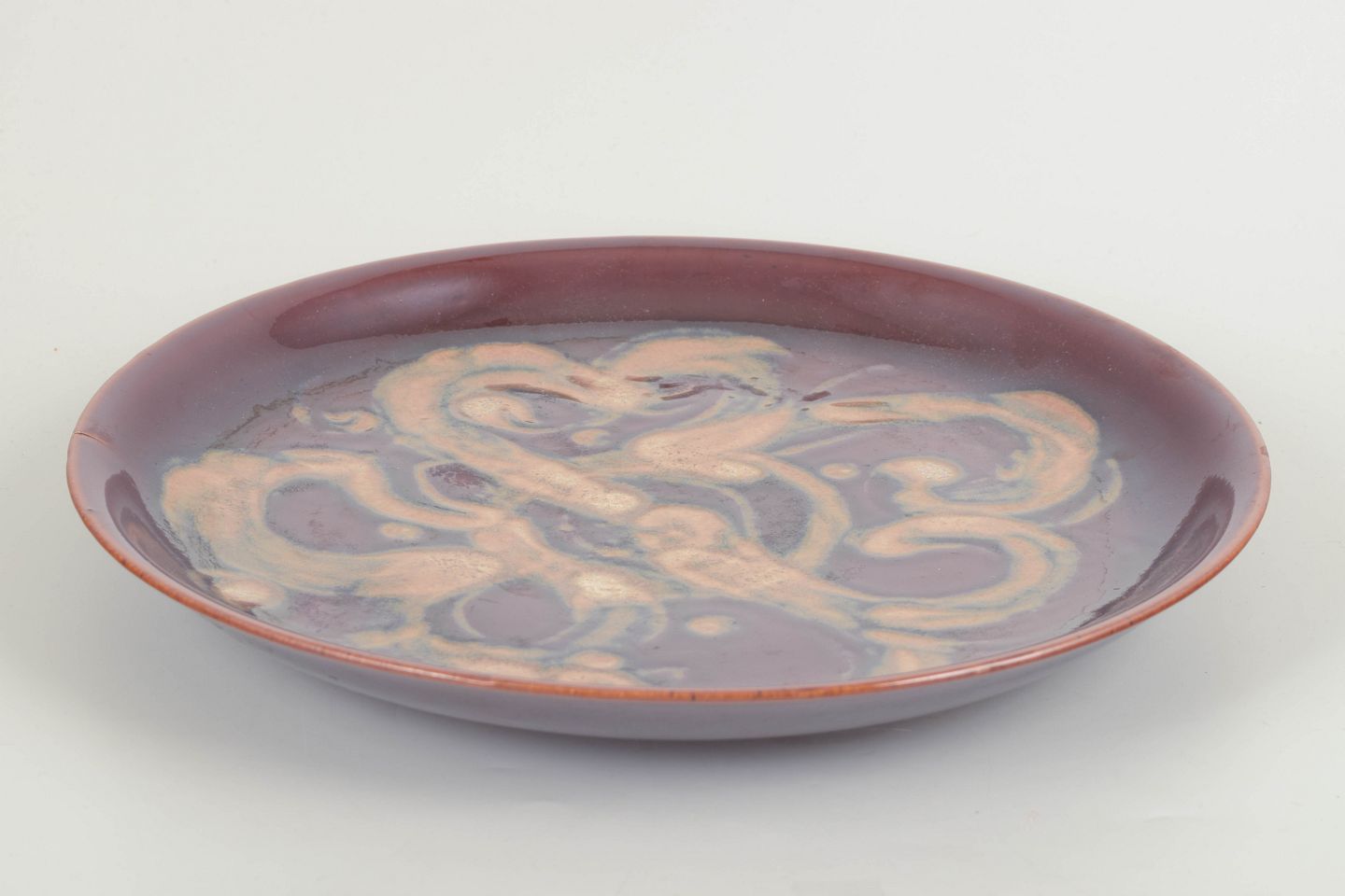 Hand-thrown stoneware dish with an experimental multicoloured glaze in shades of wine red, pink, and blue. The surface features a free ornamental pattern typical of Stålhane’s later work, where the glaze forms a dynamic, relief-like structure with a glossy finish. A striking example of his post-Rörstrand production at Designhuset.