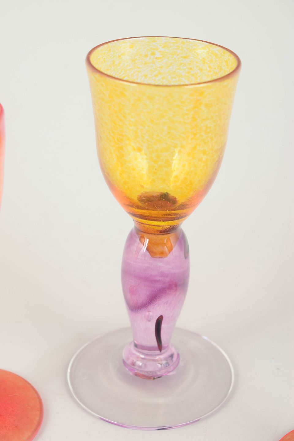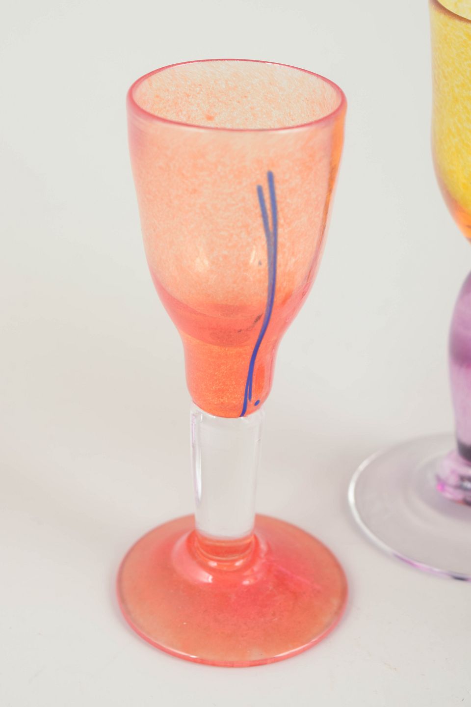 Handmade schnapps glasses in mouth-blown glass with vivid colour play in orange, pink, yellow, and blue tones. Each piece is unique with slight variations in shape and decoration, characteristic of experimental Swedish art glass from the period.