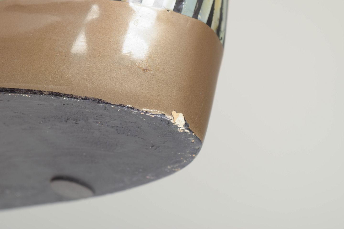 Impressive, sculptural studio vase in glazed ceramic with geometric mosaic decoration in metallic and light tones. The wide, asymmetrical form and reflective glaze give the piece a striking, decorative presence typical of European studio ceramics of the 1980s.