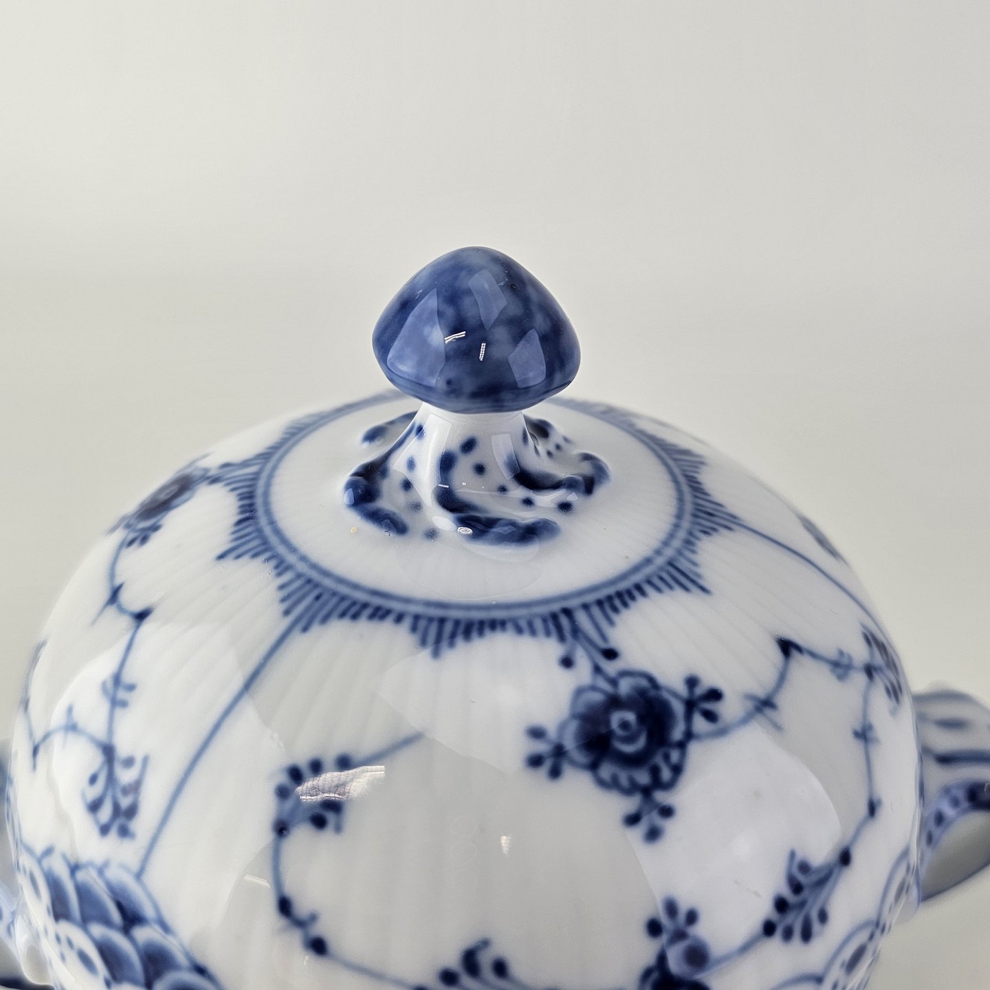Musselmalet halvblonde er riflet hvidt porcelæn med dekoration af blå ranker og en kant med blonder.