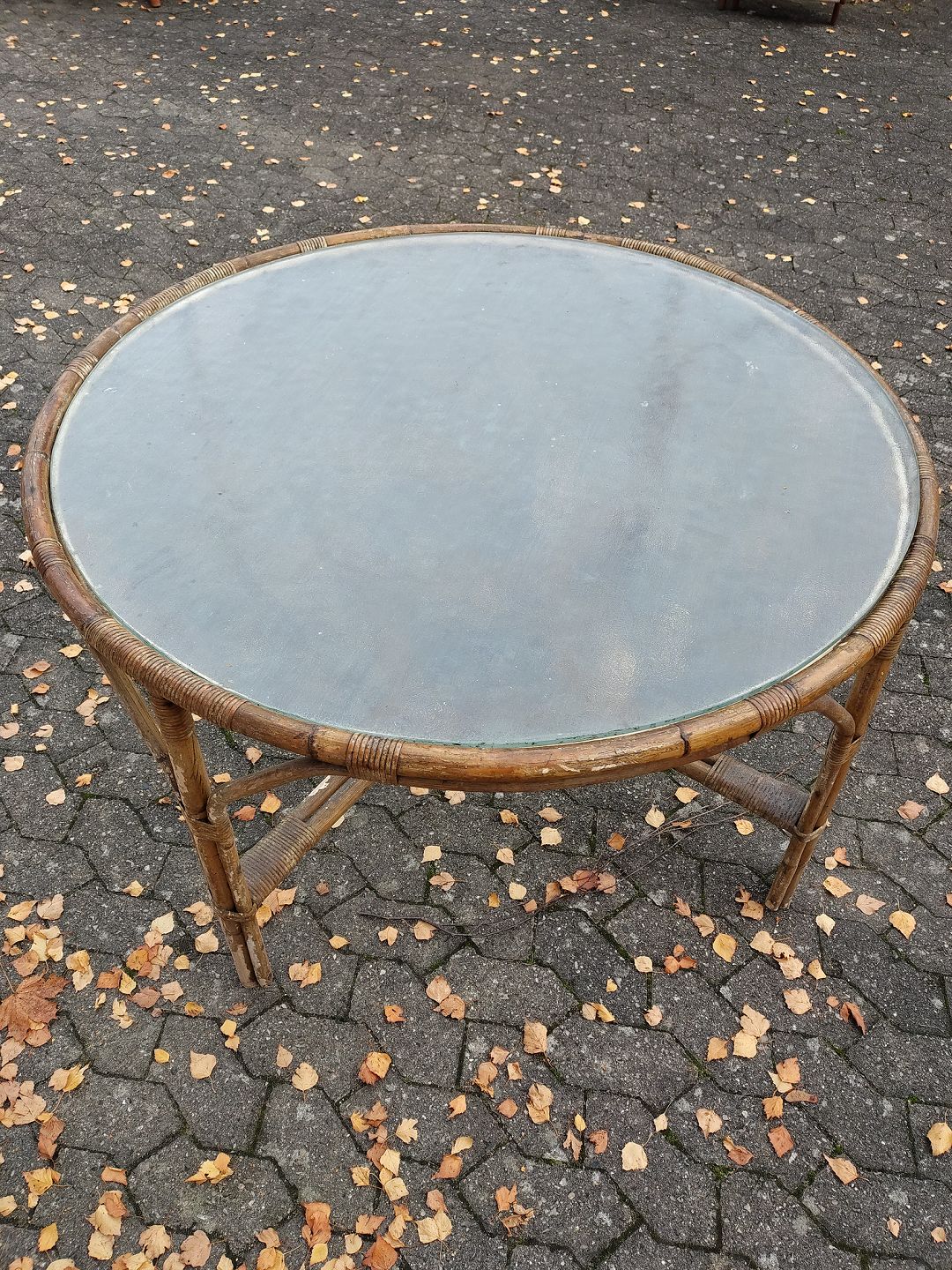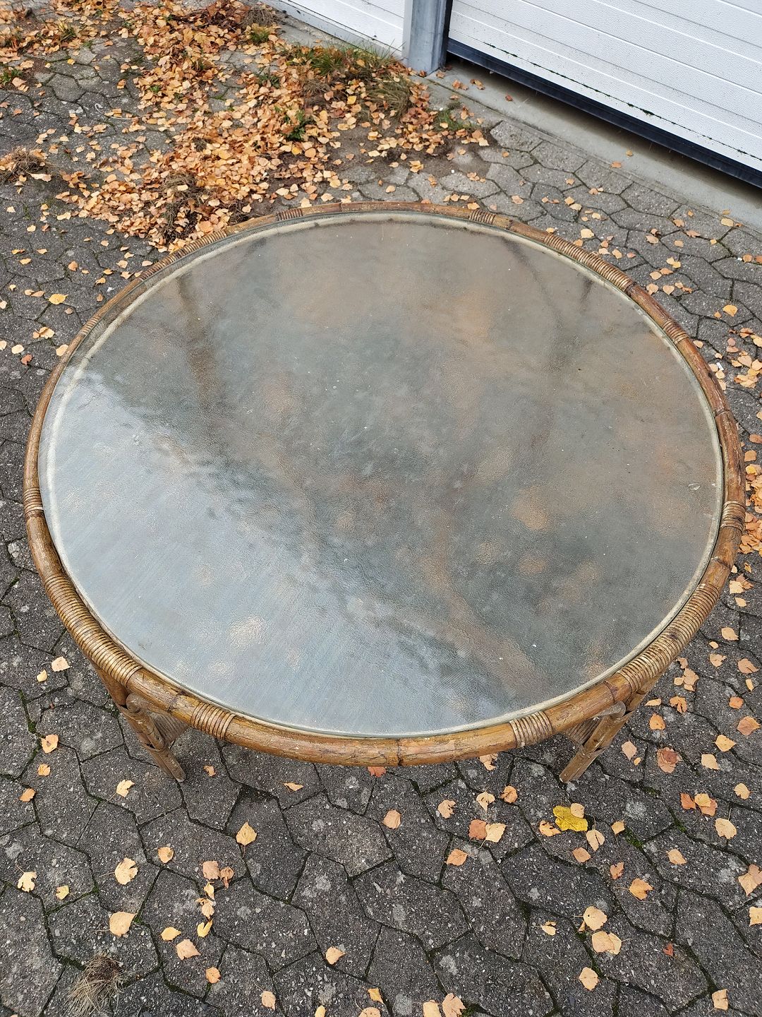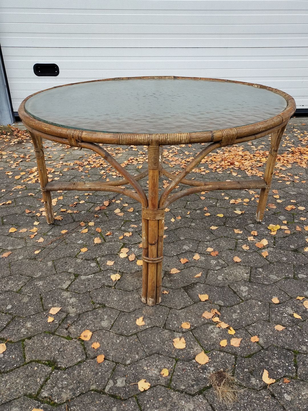 Bambusbord med glasplade, fra 1970erne.Det har brugsspor og trænger til at blive peppet op.