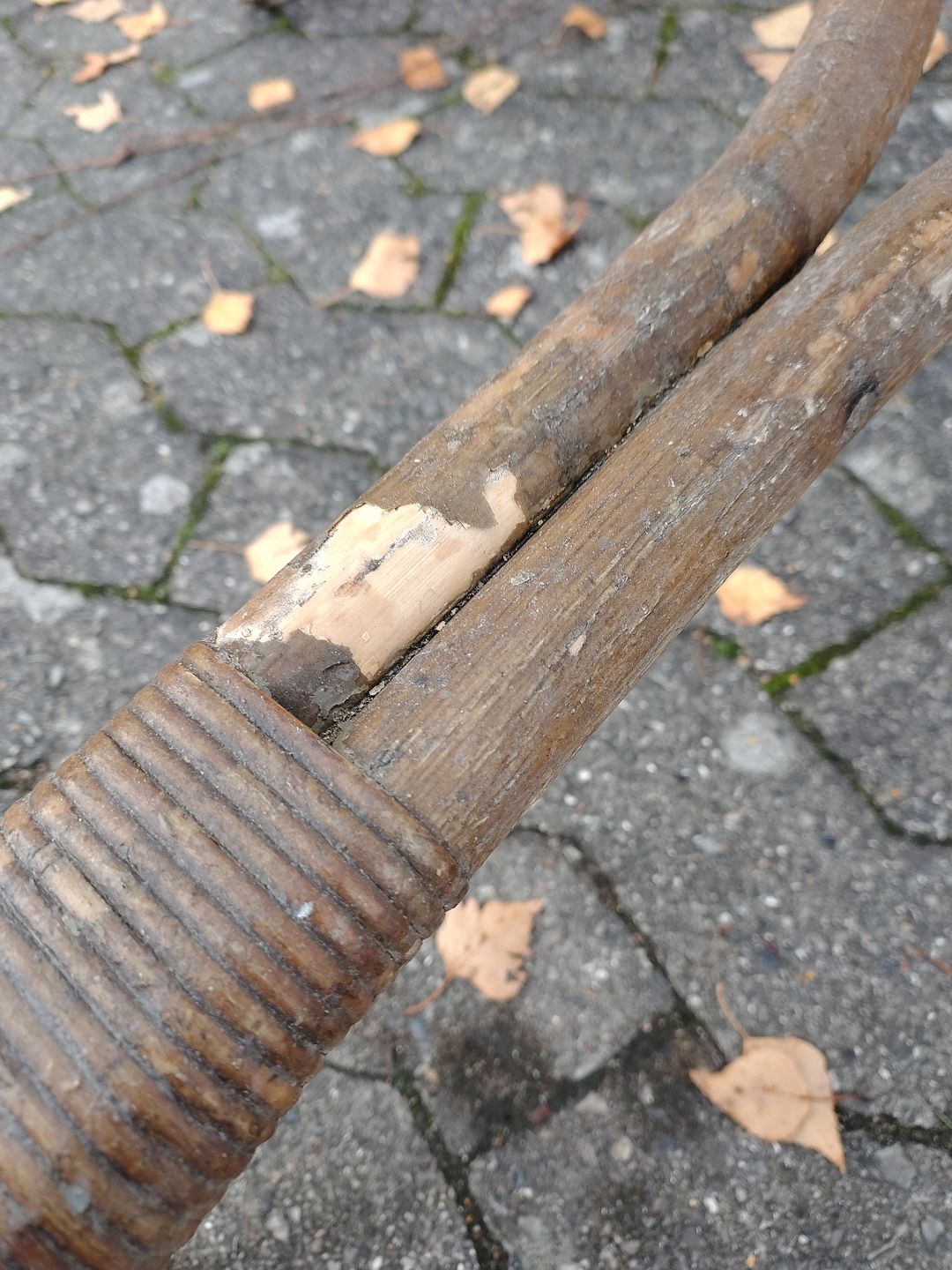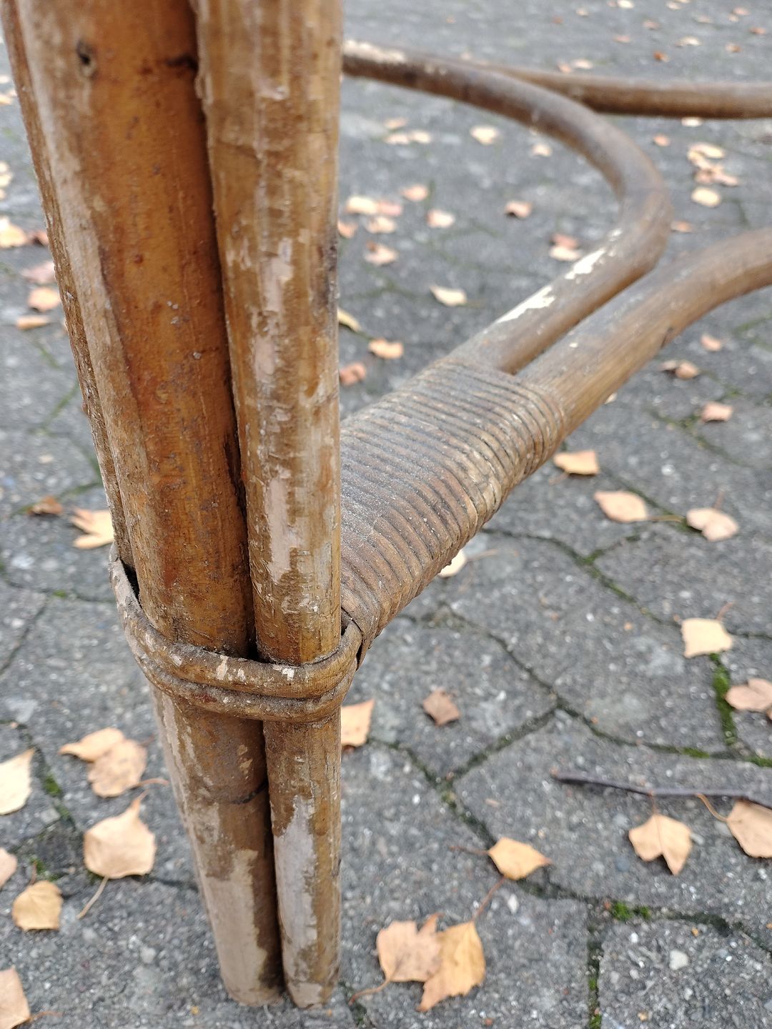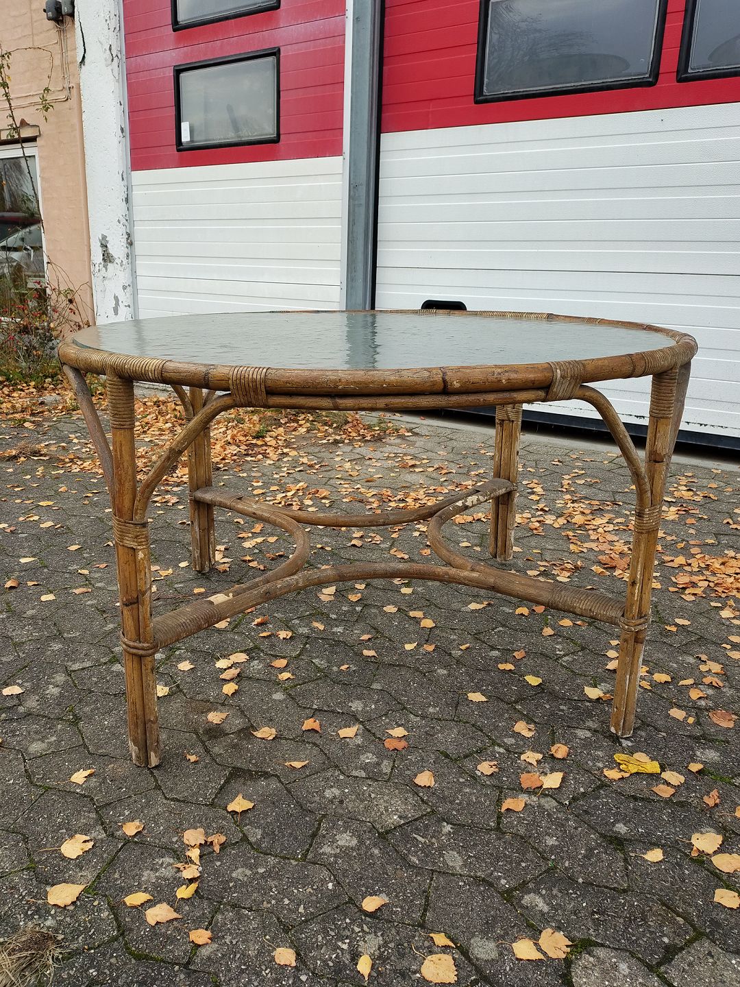 Bambusbord med glasplade, fra 1970erne.Det har brugsspor og trænger til at blive peppet op.