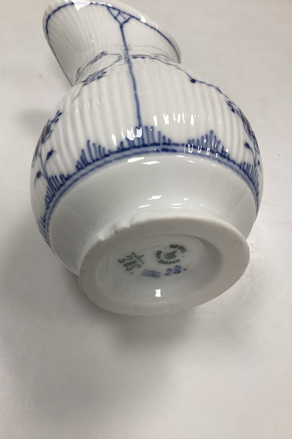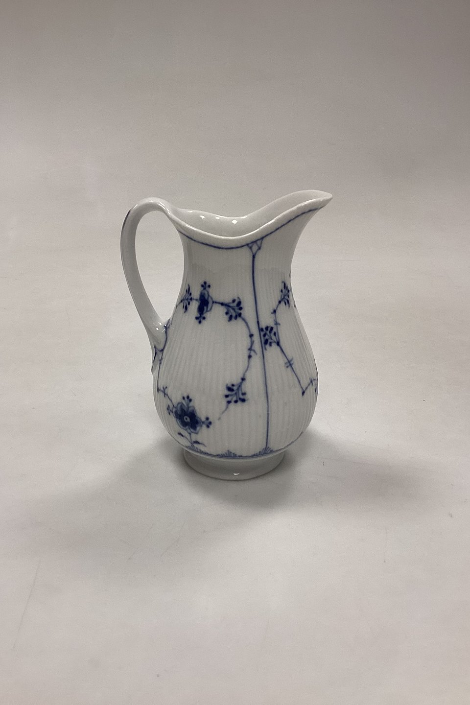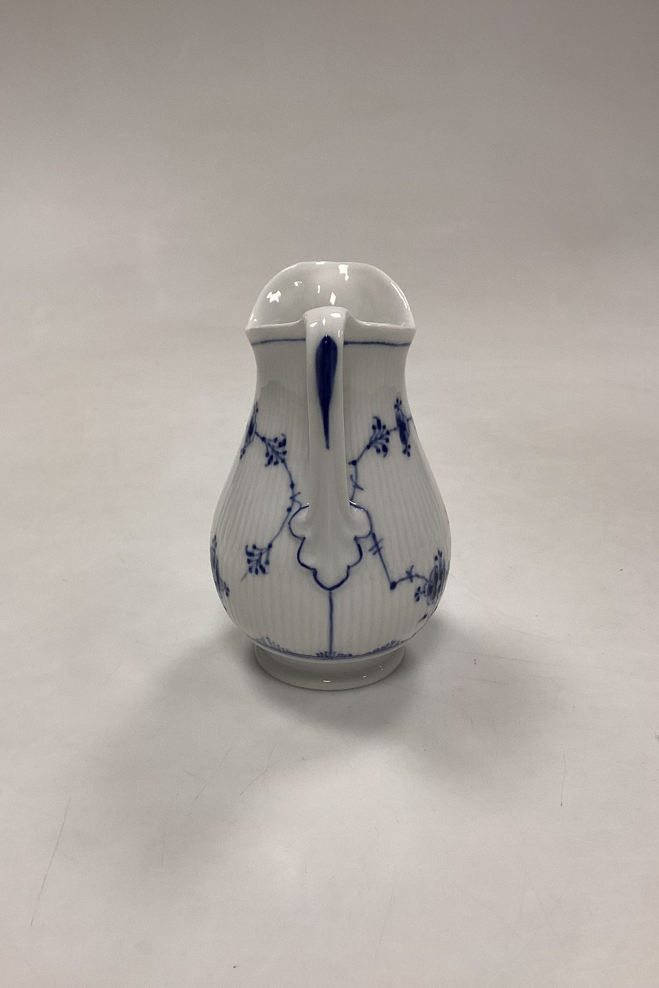 Royal Copenhagen Blue Fluted Plain Cream Jug No. 385. Has small chips at the bottom, see photo.Measures 12.5 cm / 4.92 in. 2nd Quality