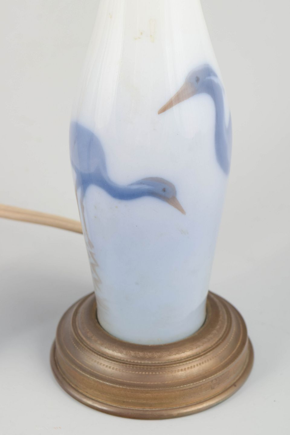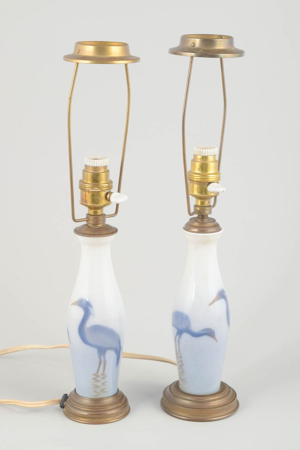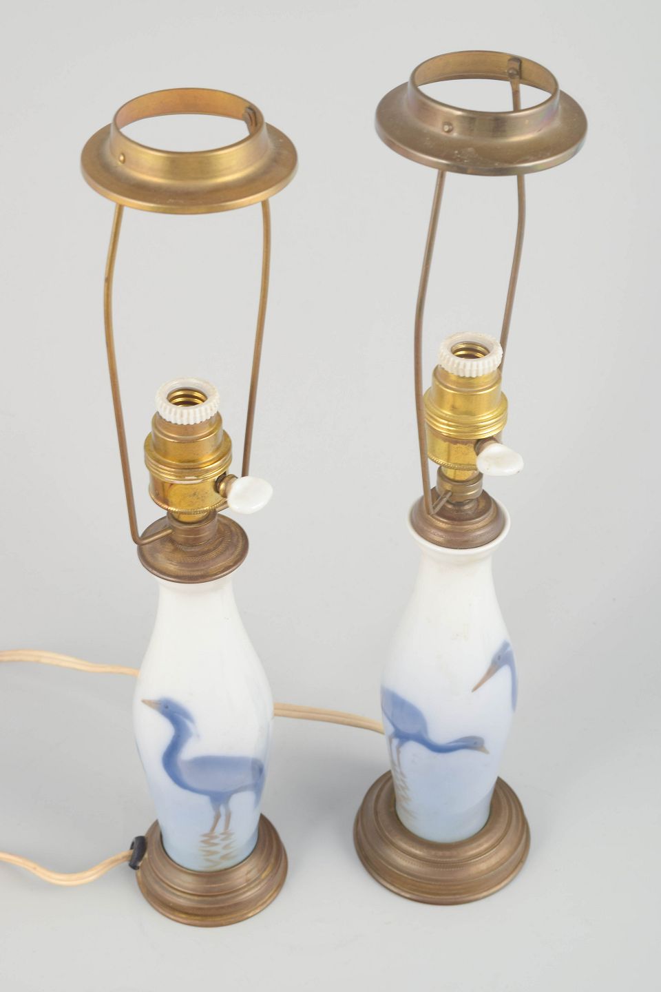 Pair of small table lamps in porcelain and brass, early 20th century.Elegant pair of table lamps with hand-painted heron motifs in blue tones on white porcelain, mounted with original fittings and patinated brass details. A classic design reflecting early 20th-century aesthetics.