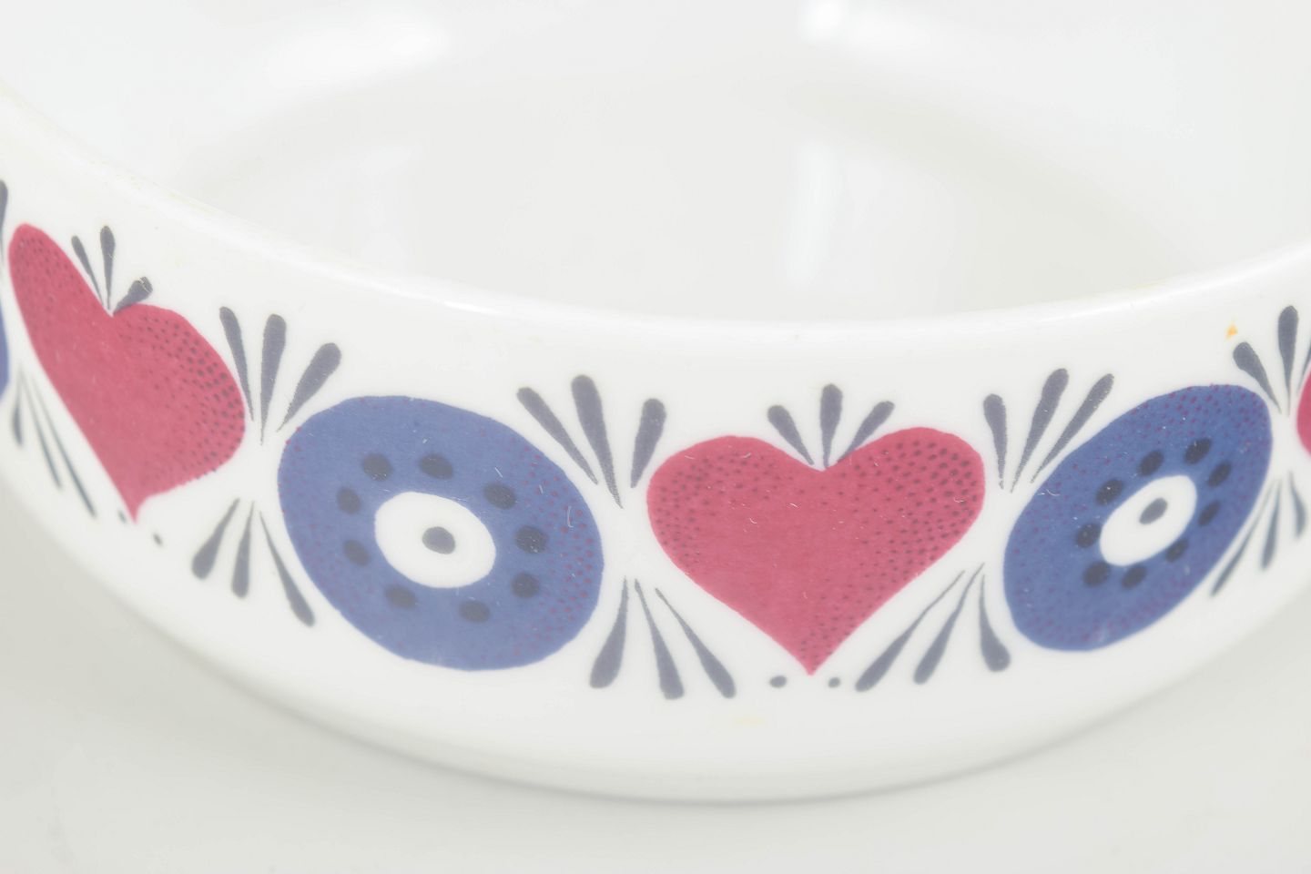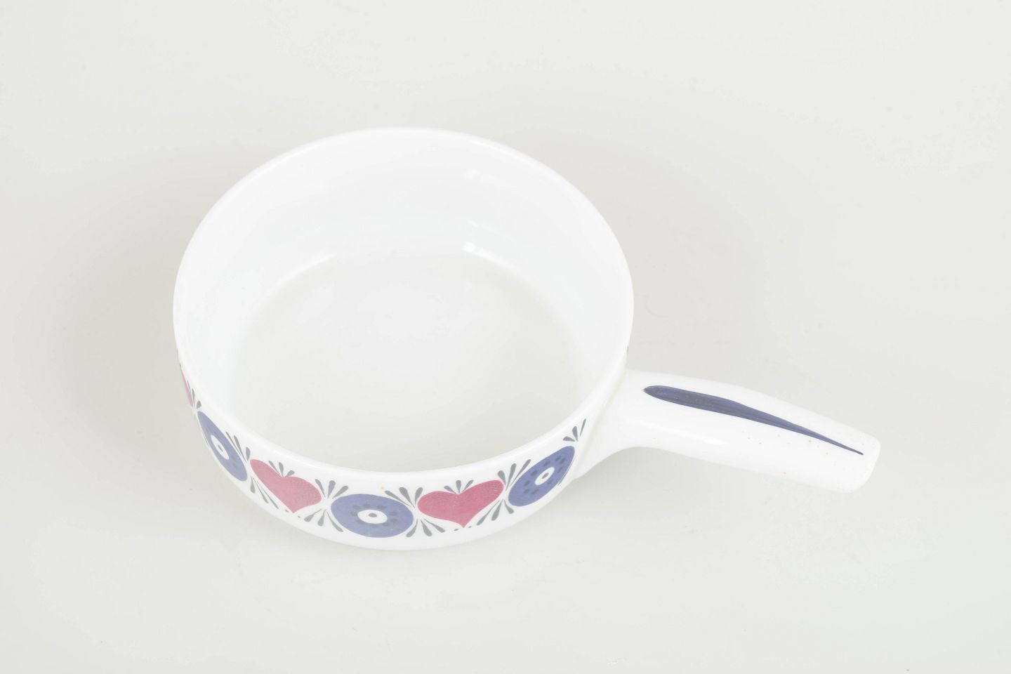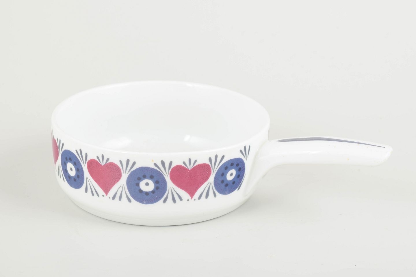 Decorated with Westman’s iconic retro floral motif in blue and pink on a white ground. Made in Rörstrand’s heat-resistant “El-Fast” stoneware, suitable for both oven and table use.
