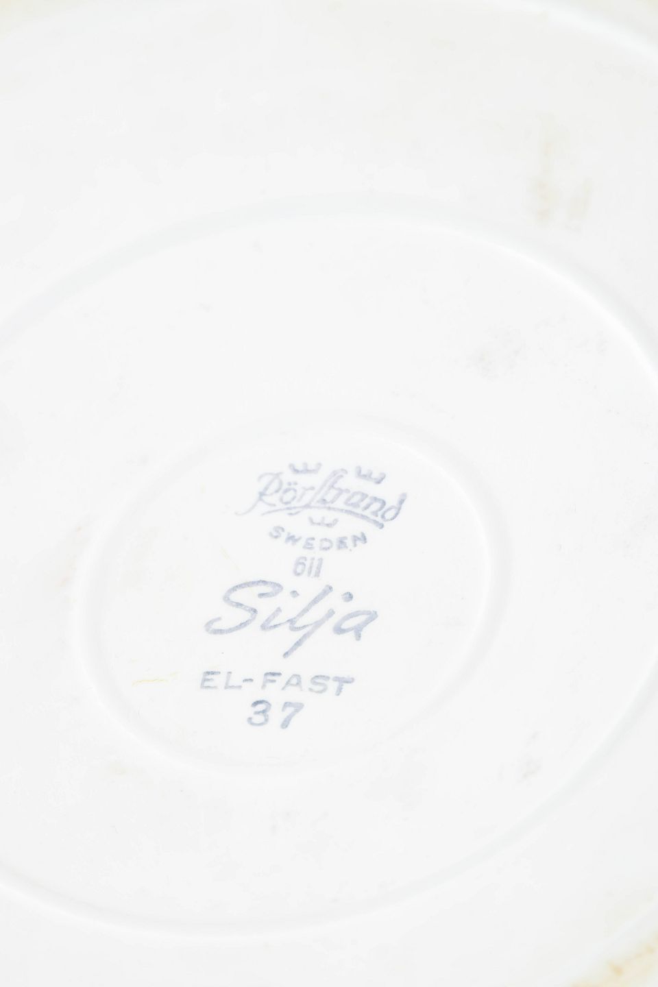 Decorated with Westman’s signature retro floral motif in blue and pink on a white ground. The Silja series was produced as part of Rörstrand’s “El-Fast” stoneware – practical, heat-resistant, and attractive for table service.
