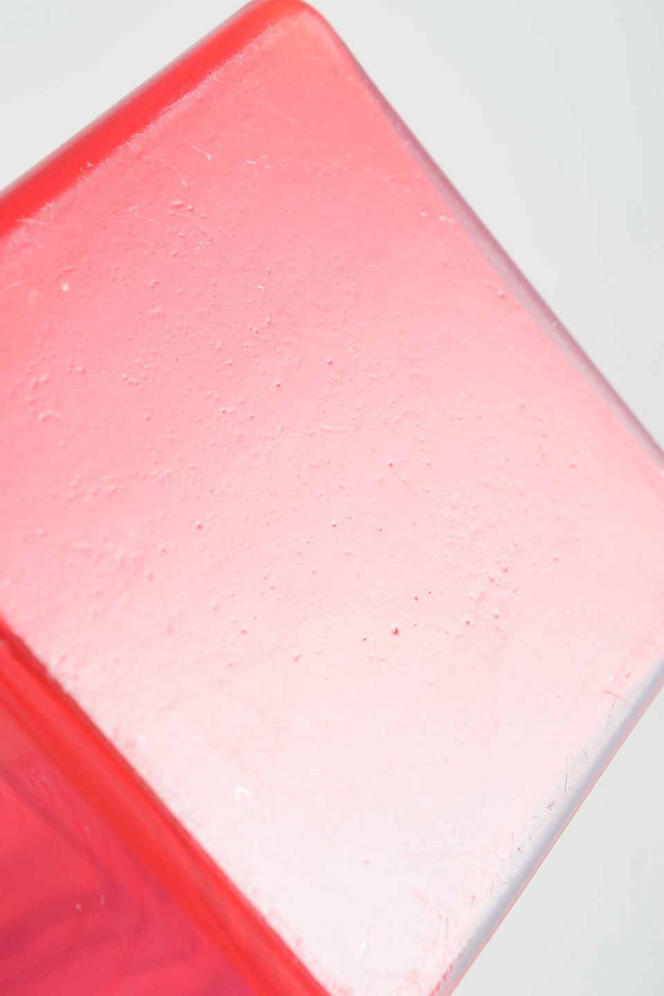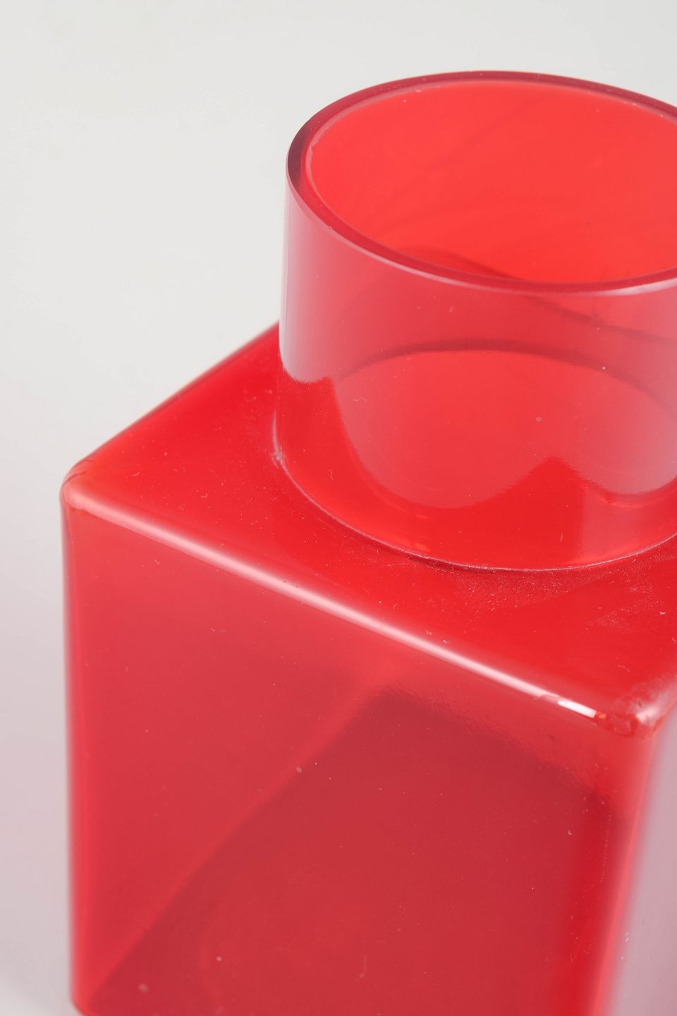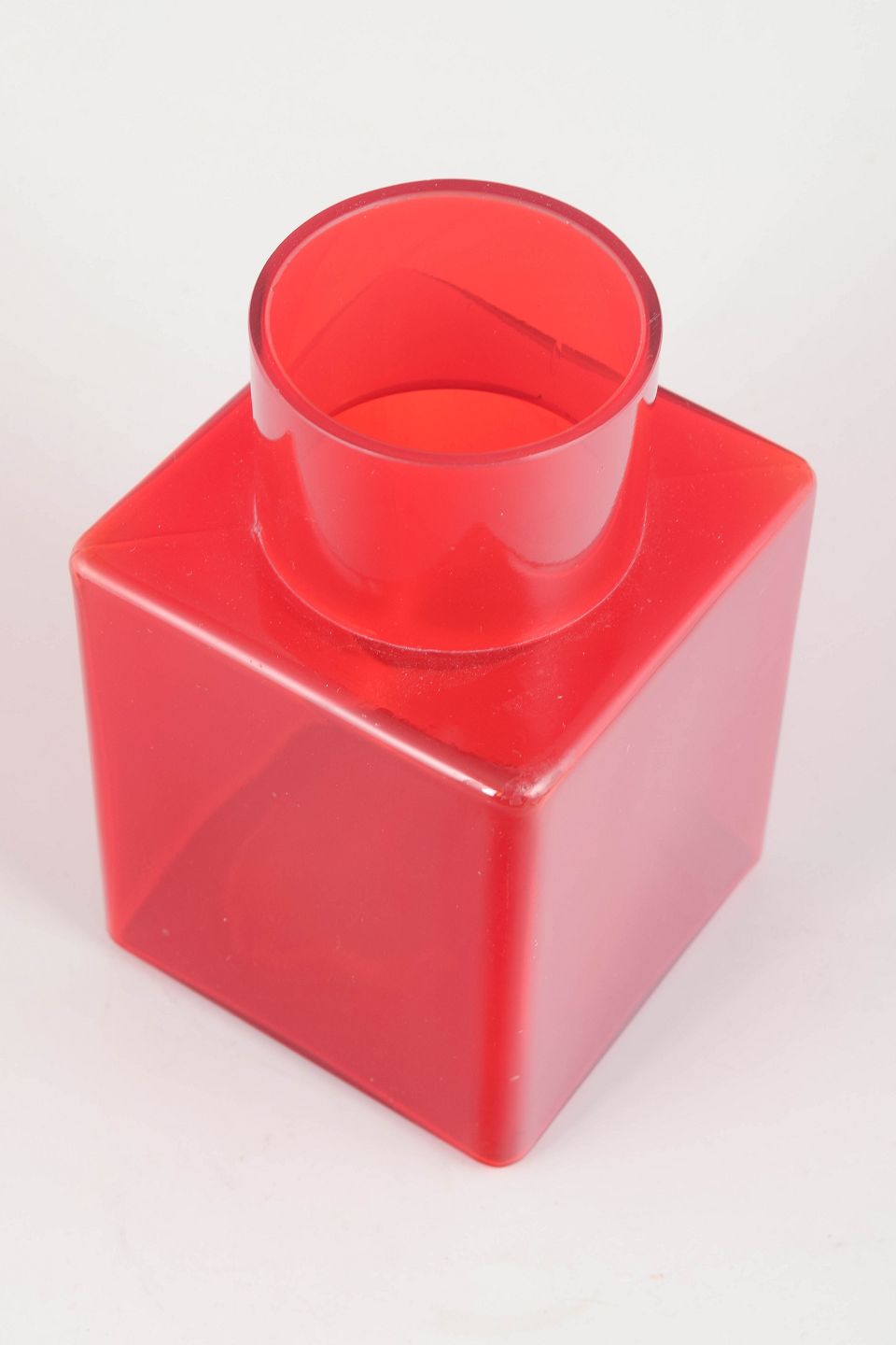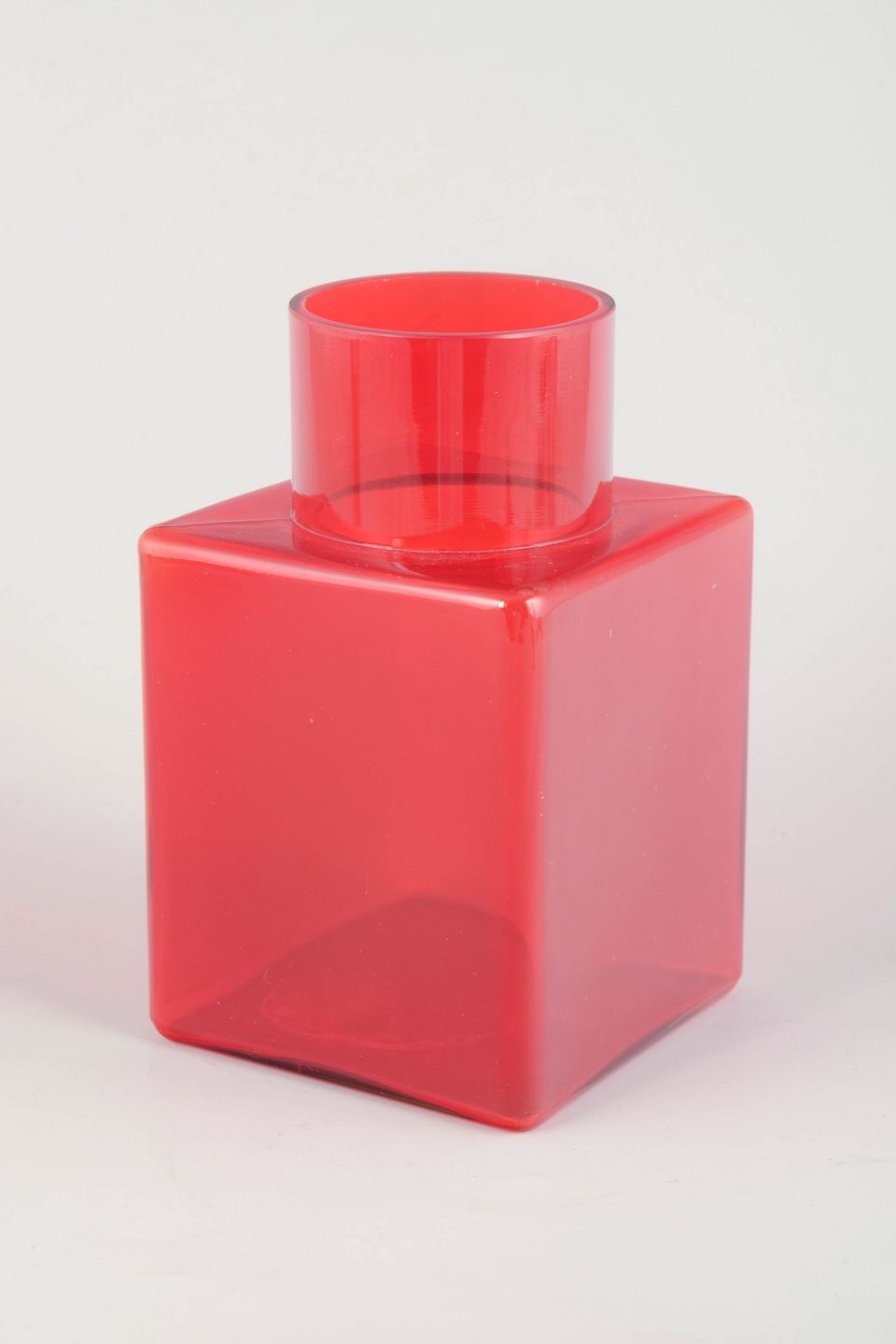 Geometric vase in clear red glass with a cylindrical neck and square body – a fine example of Italian Murano design from the period.
