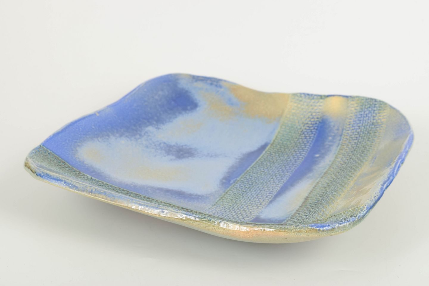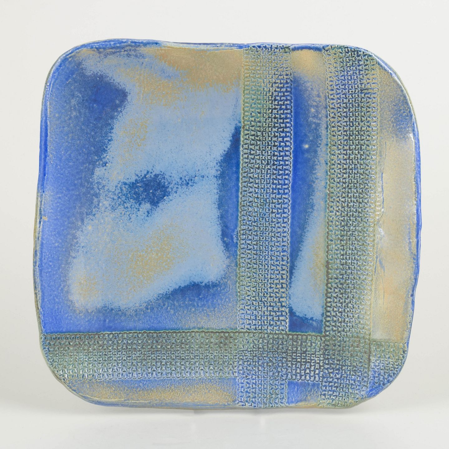 Handcrafted square wall dish in stoneware with experimental glaze in blue, green and golden tones. Decorated with relief textures and geometric fields in layered composition.