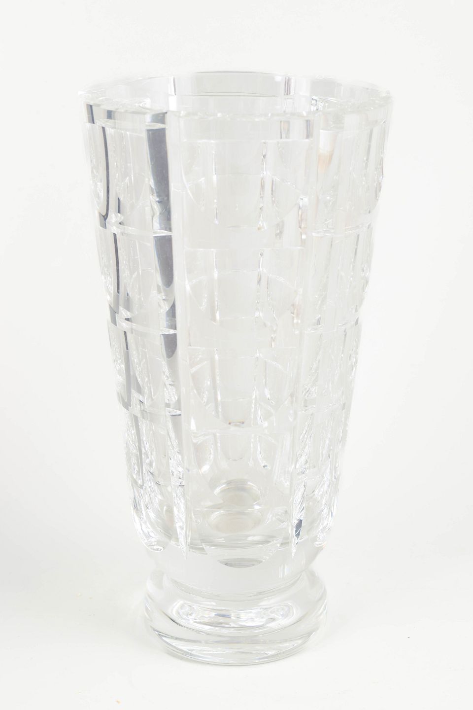 Elegant, heavy crystal vase with characteristic geometric cut decoration, designed by Simon Gate for Orrefors. The series is celebrated for its precision craftsmanship and refined light refractions, creating an architectural expression.