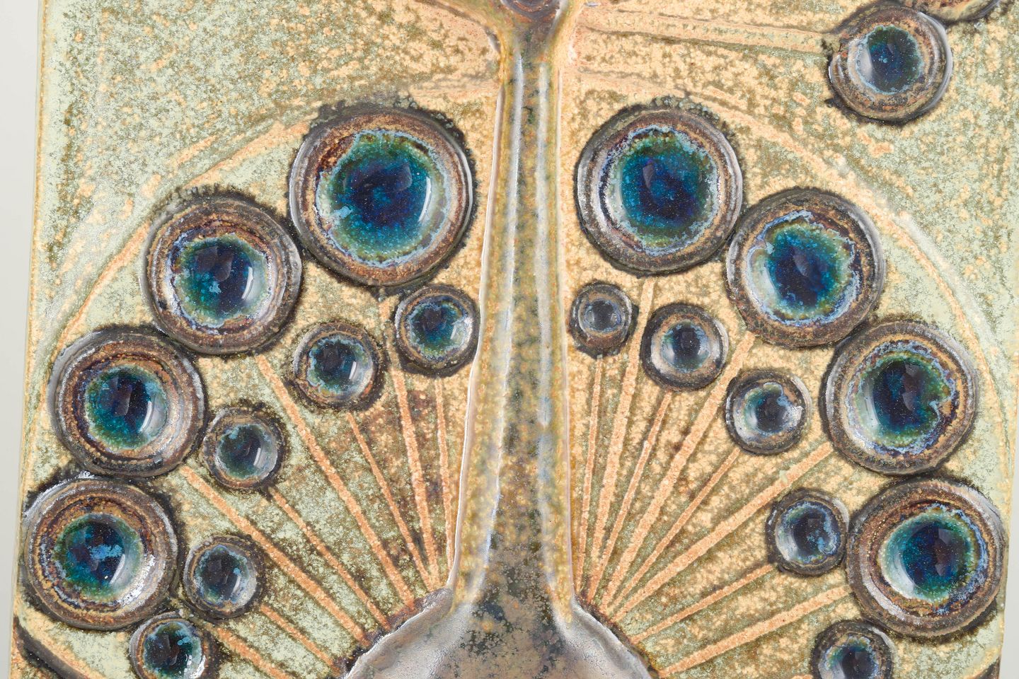 Ceramic wall relief with stylised peacock motif in green and blue glaze tones.