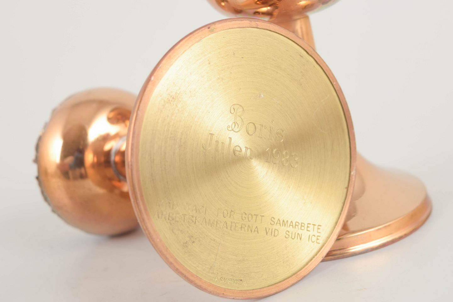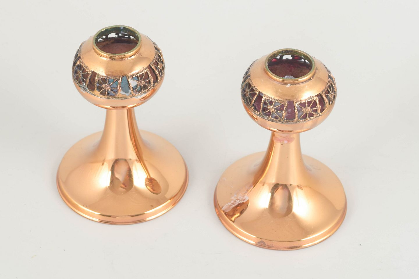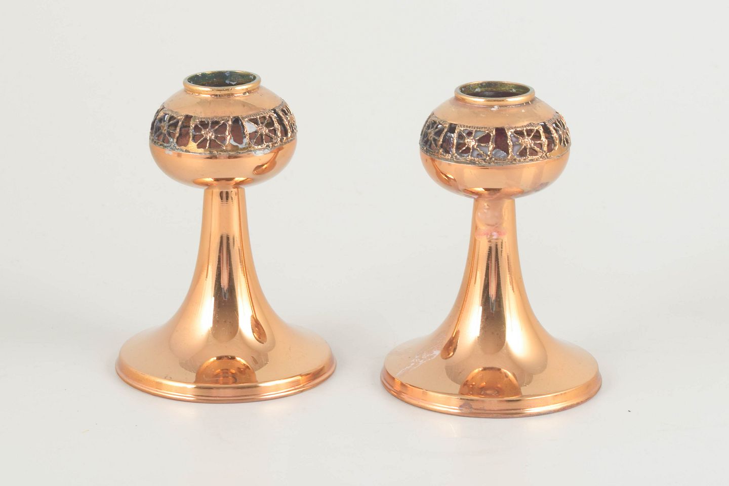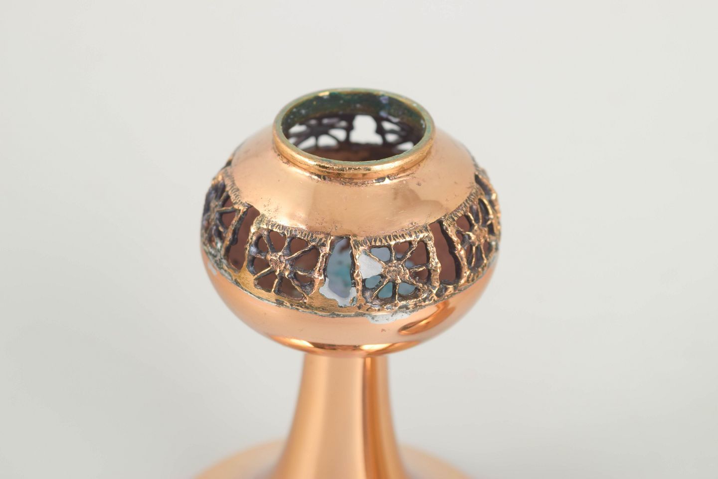 Elegant pair of brass candlesticks with decorative enamel in dark green and black tones around the top. The sculptural shape highlights the refined aesthetics of Nordic modernism.