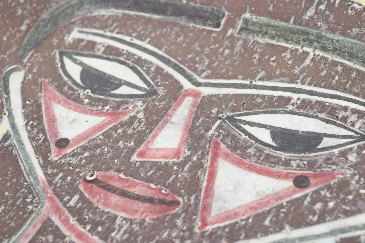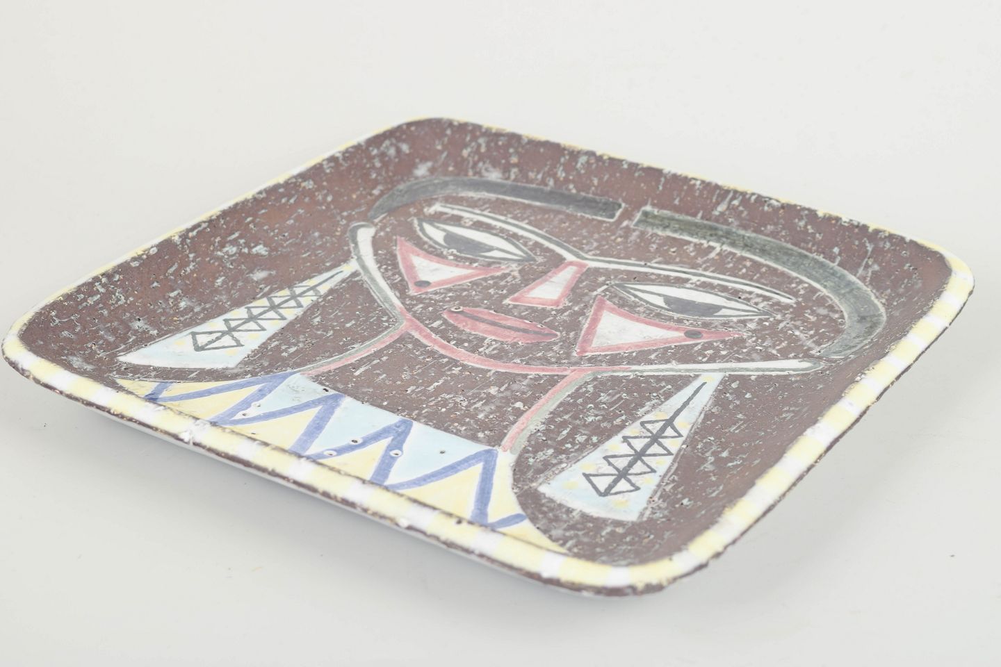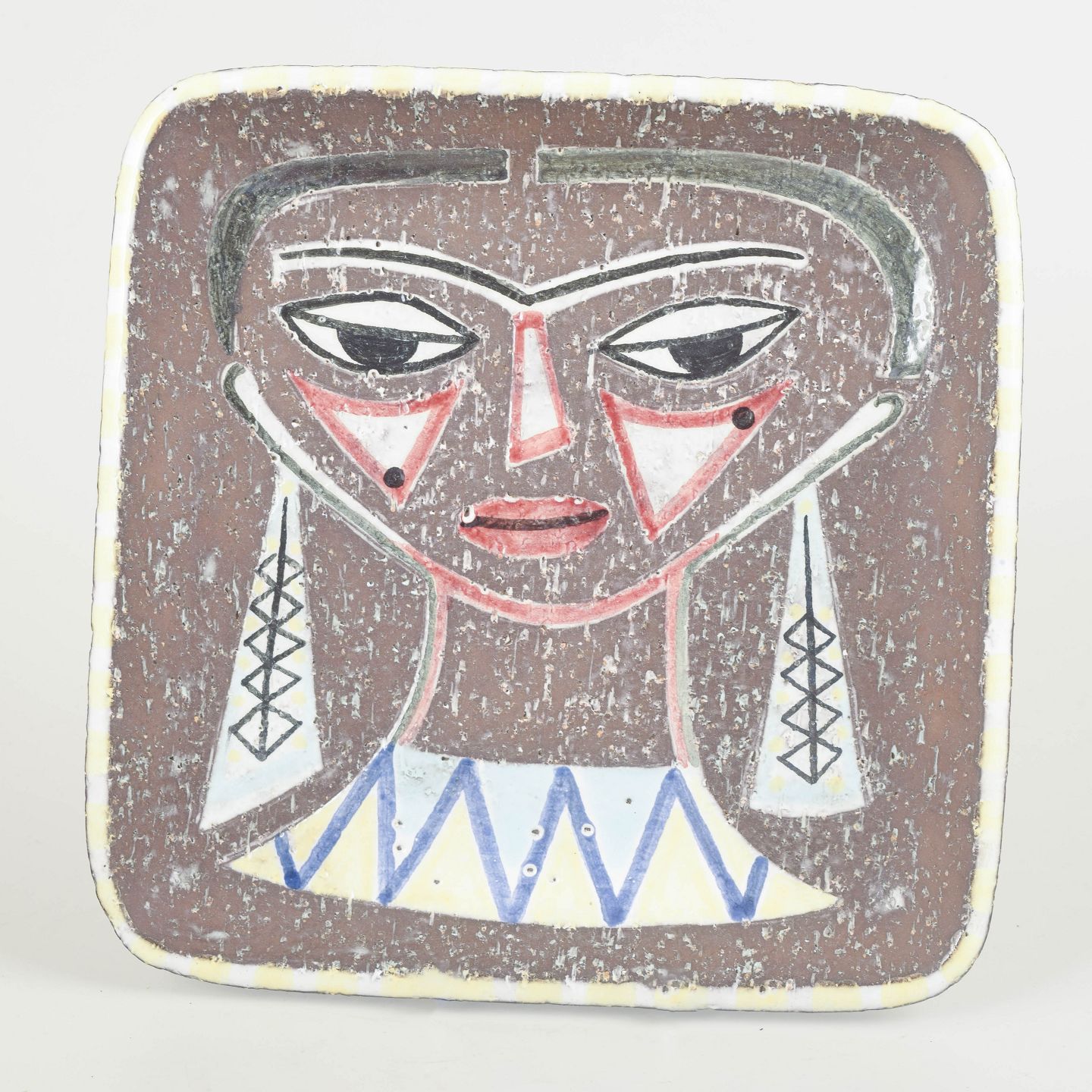 Square dish in glazed stoneware with a stylised female portrait in geometric forms and colours of brown, white, red, blue, and black. Signed on the reverse.