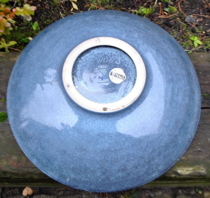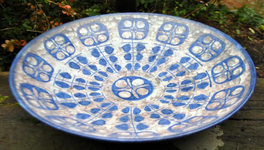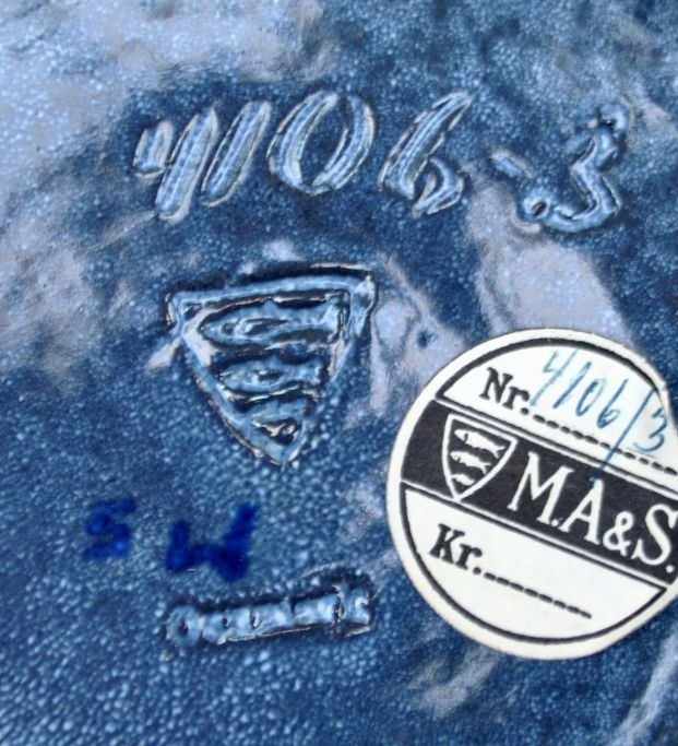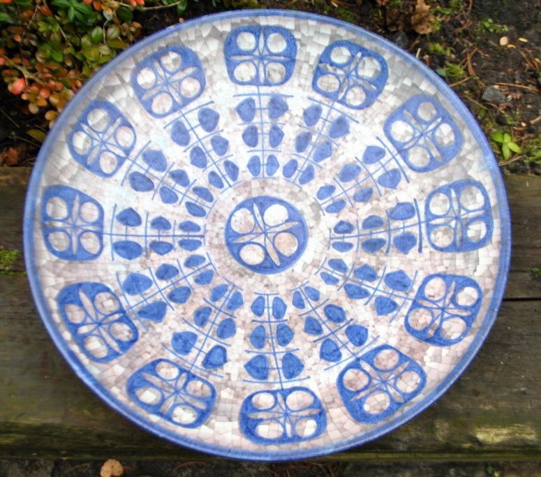 Michael Andersen & Søn ceramic dish no. 4106-3, Bornholm, Denmark, after 1930. Decorated in blue/grey shades on a mosaic base. Signed MS and stamped with three fish. Dia: 40 cm.Item number: 28554