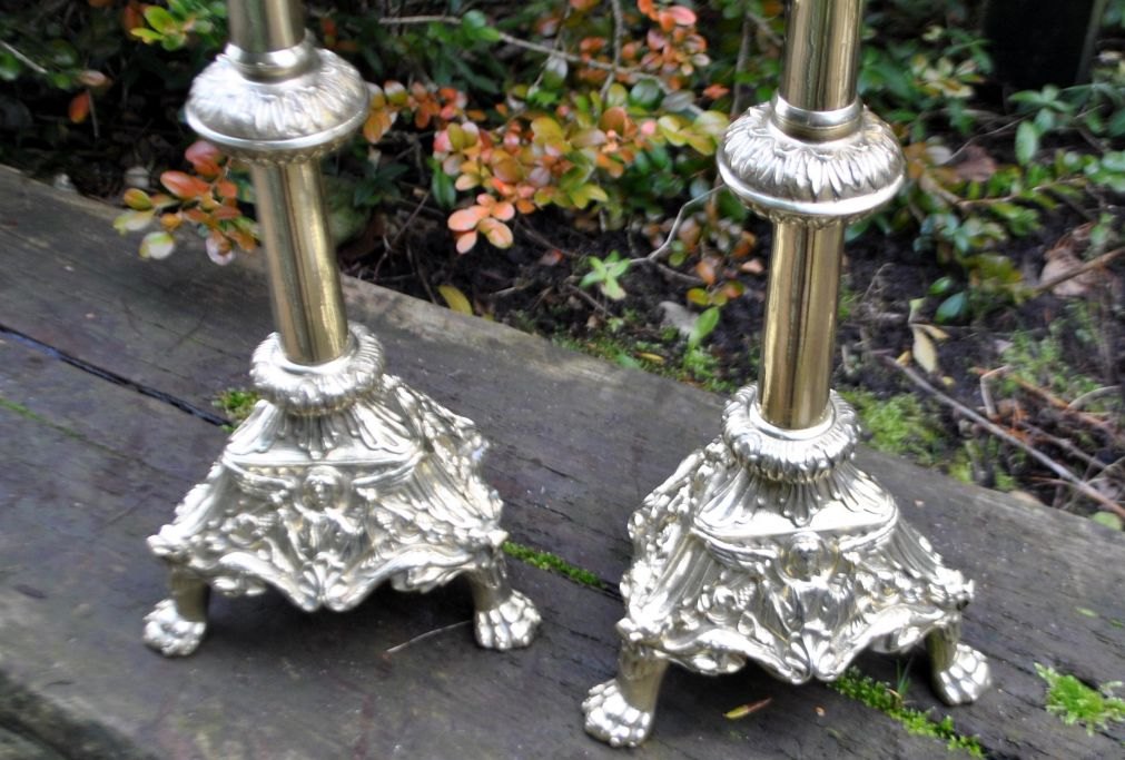 Pair of French church candlesticks in brass, 19th century. With lion feet. Base with angels. H.: 40 cm.Appears freshly polished.