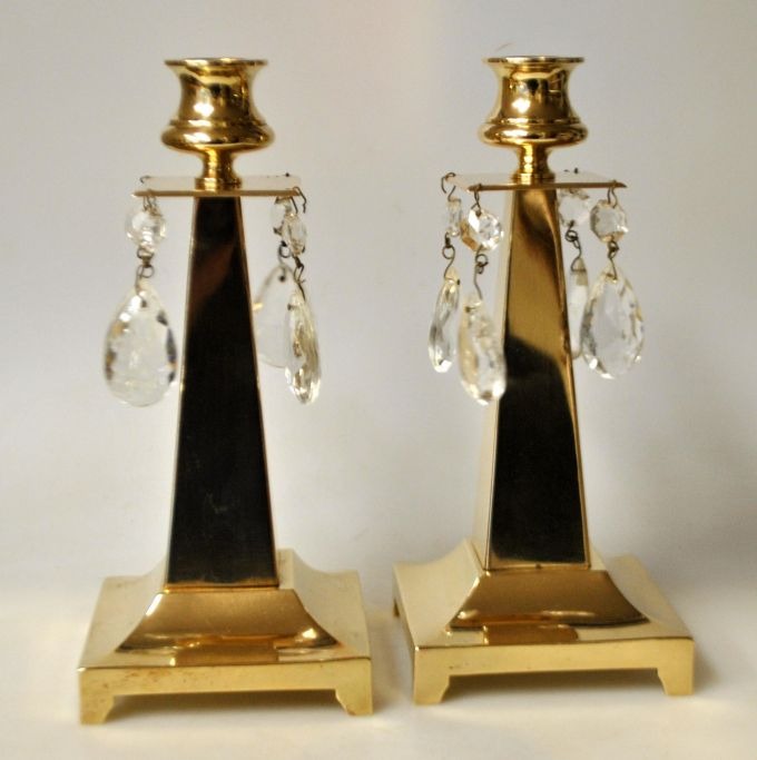 Pair of Danish art deco brass candlesticks with prisms, circa 1920. Height: 21 cm.Item number: 28572