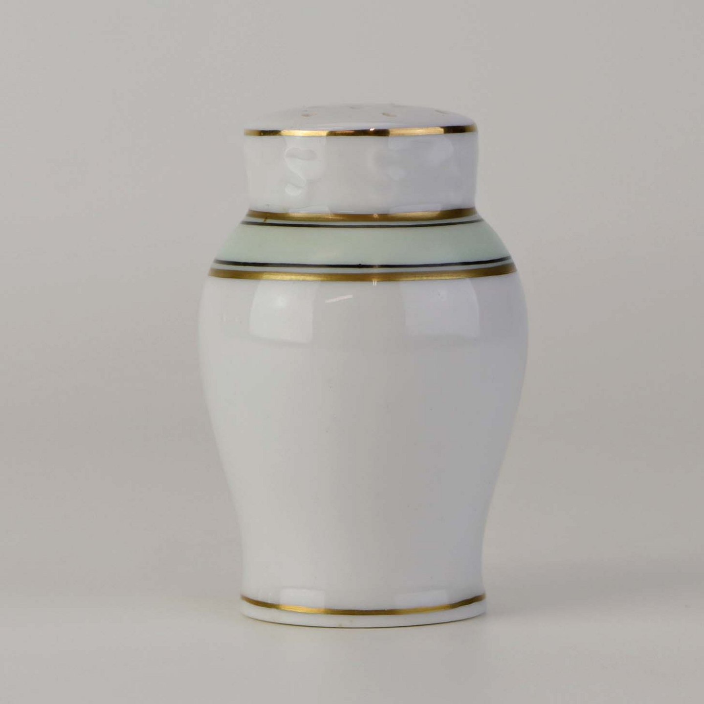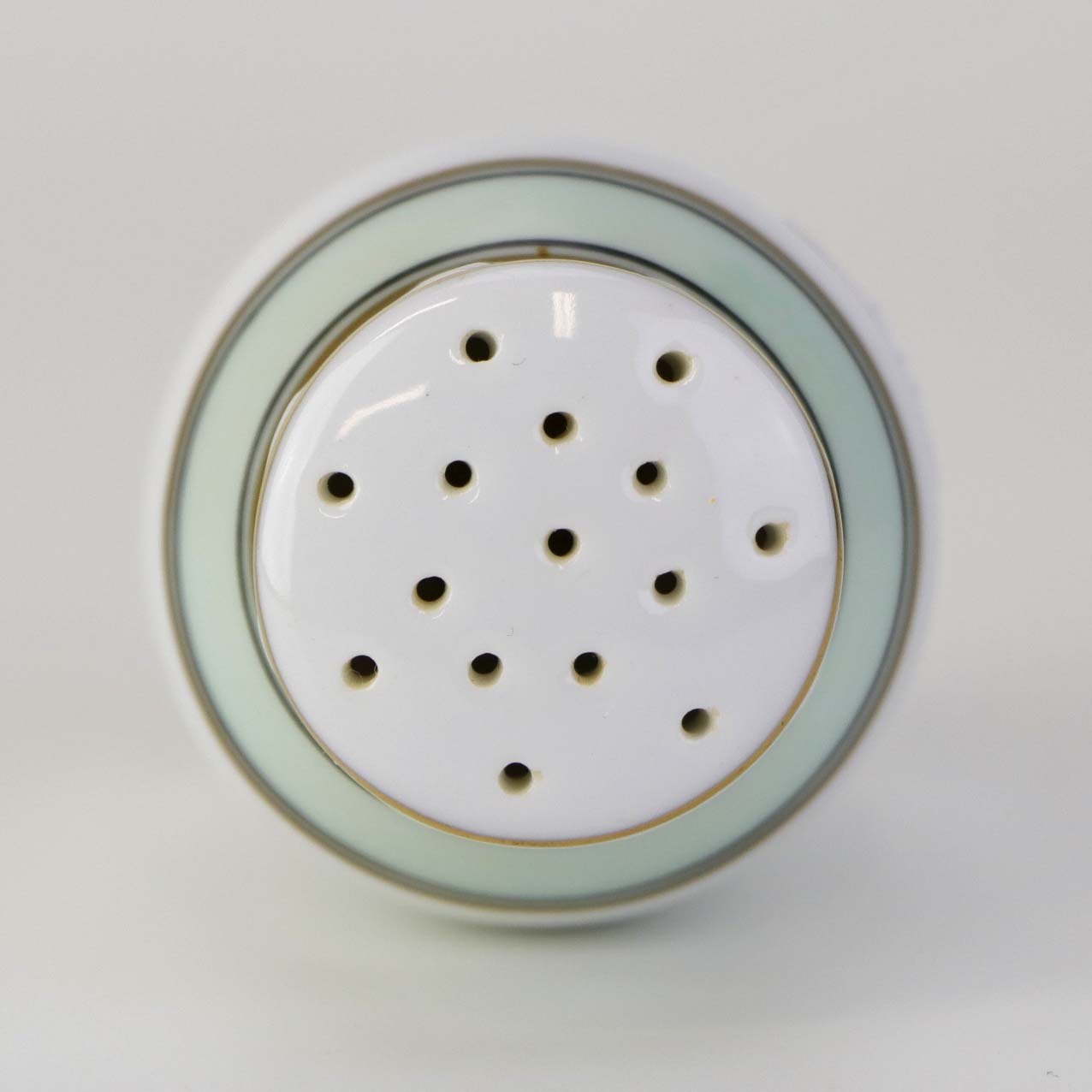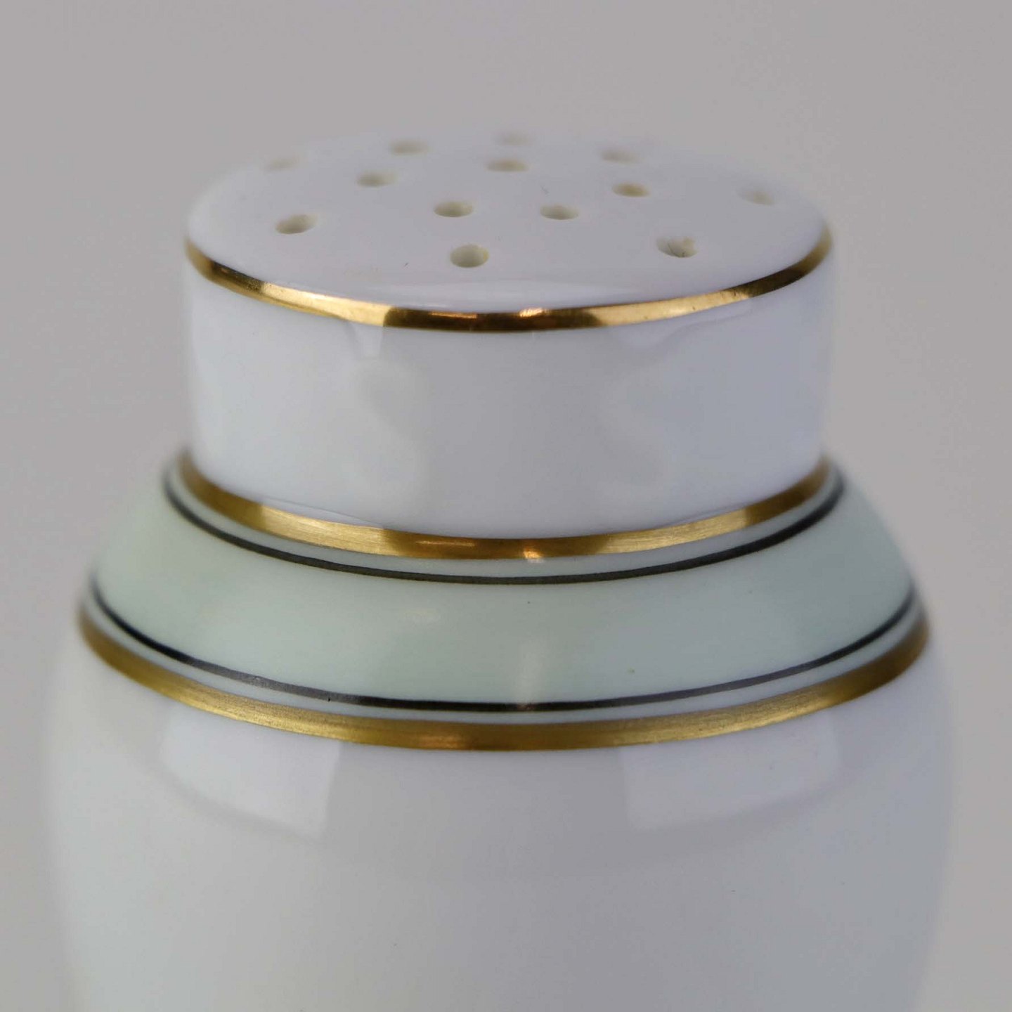 Glat hvidt porcelæn med lysegrøn bord og guldkant