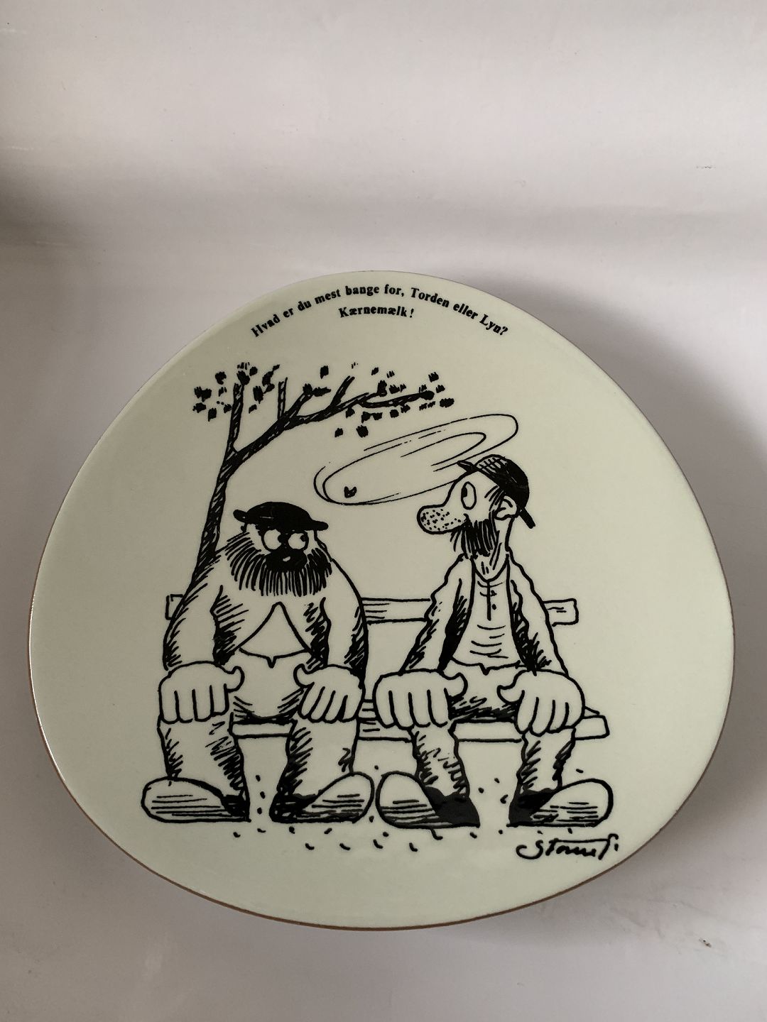 Knabstrup Plate with Storm P. Motif and VerseText:- What are you most afraid of, Thunder or Lightning?