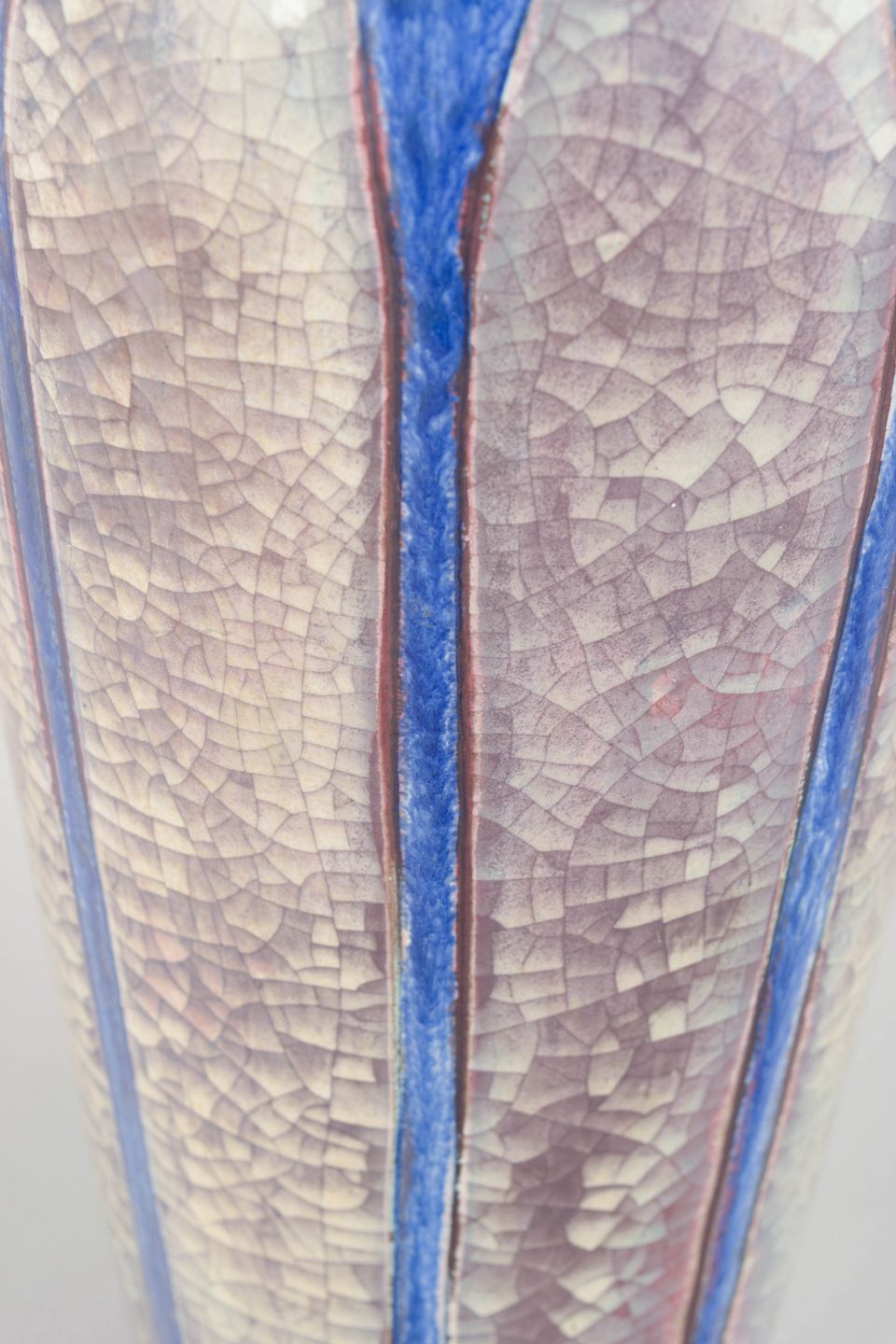 Impressive tall ceramic vase with a strong iridescent glaze in blue, silver and red tones. The faceted, geometric architecture is typical of Starck’s celebrated work for Michael Andersen on the island of Bornholm.