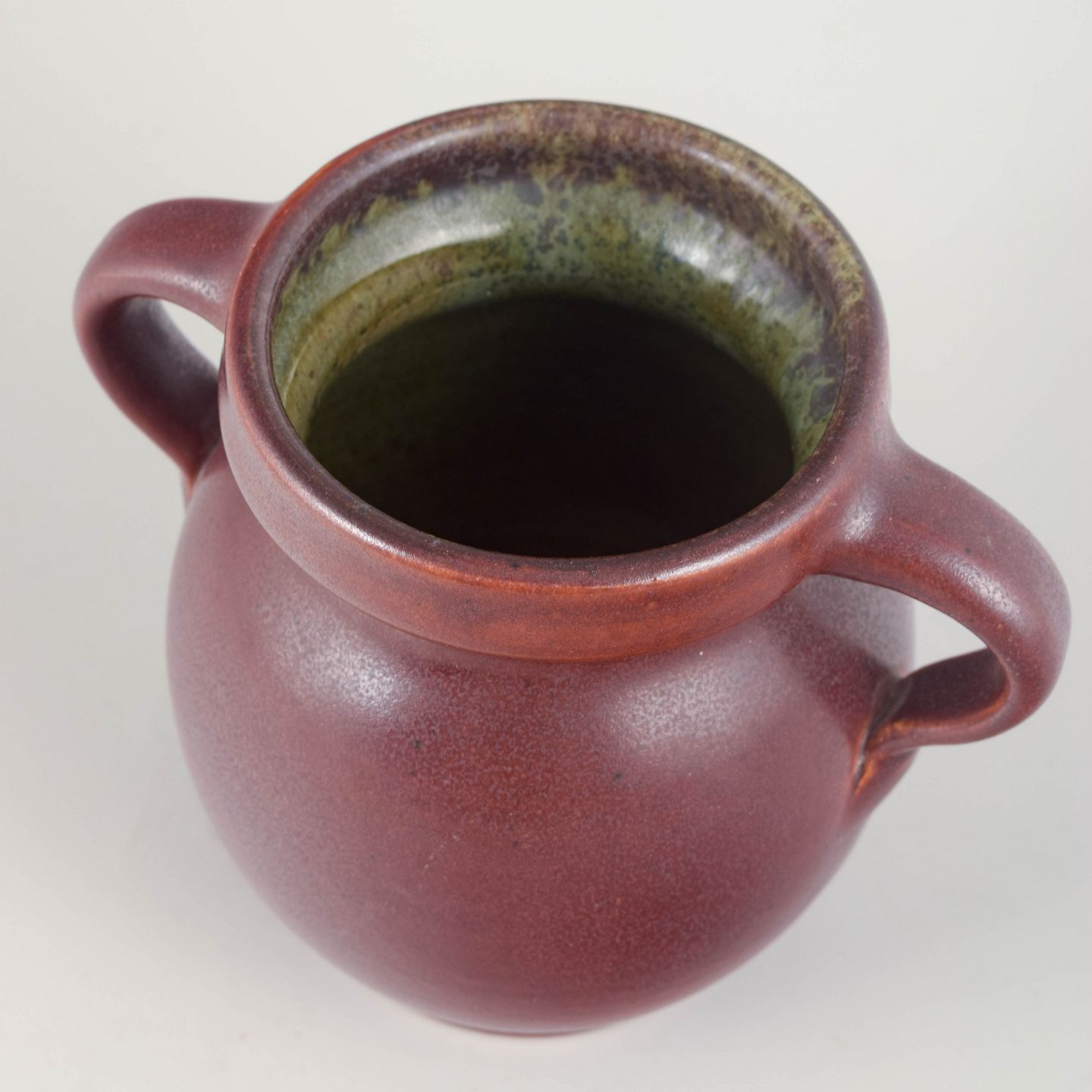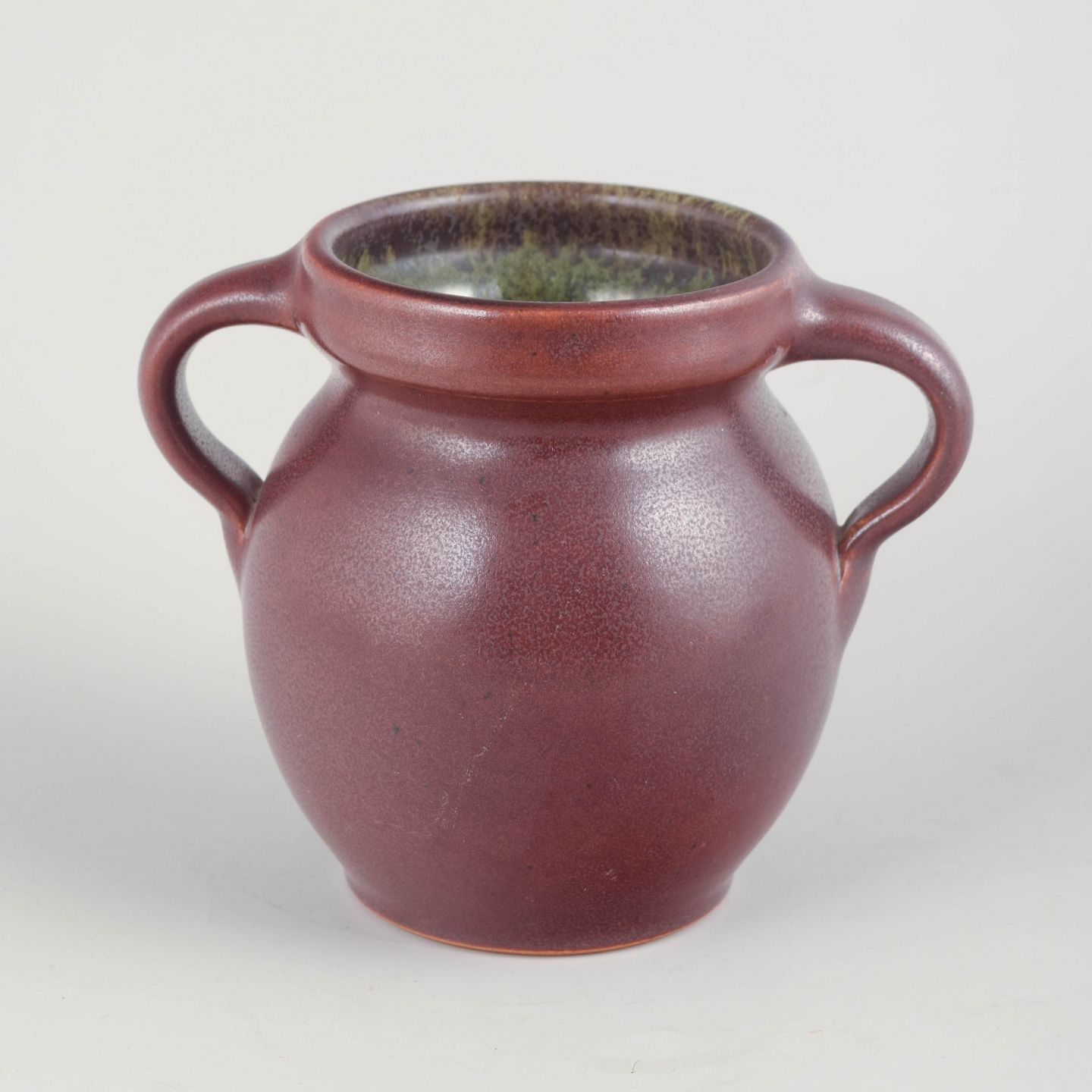 Hand-thrown stoneware vase in a deep reddish-violet glaze with subtle variation and a contrasting multicoloured interior glaze. Softly rounded body with elegant double handles.