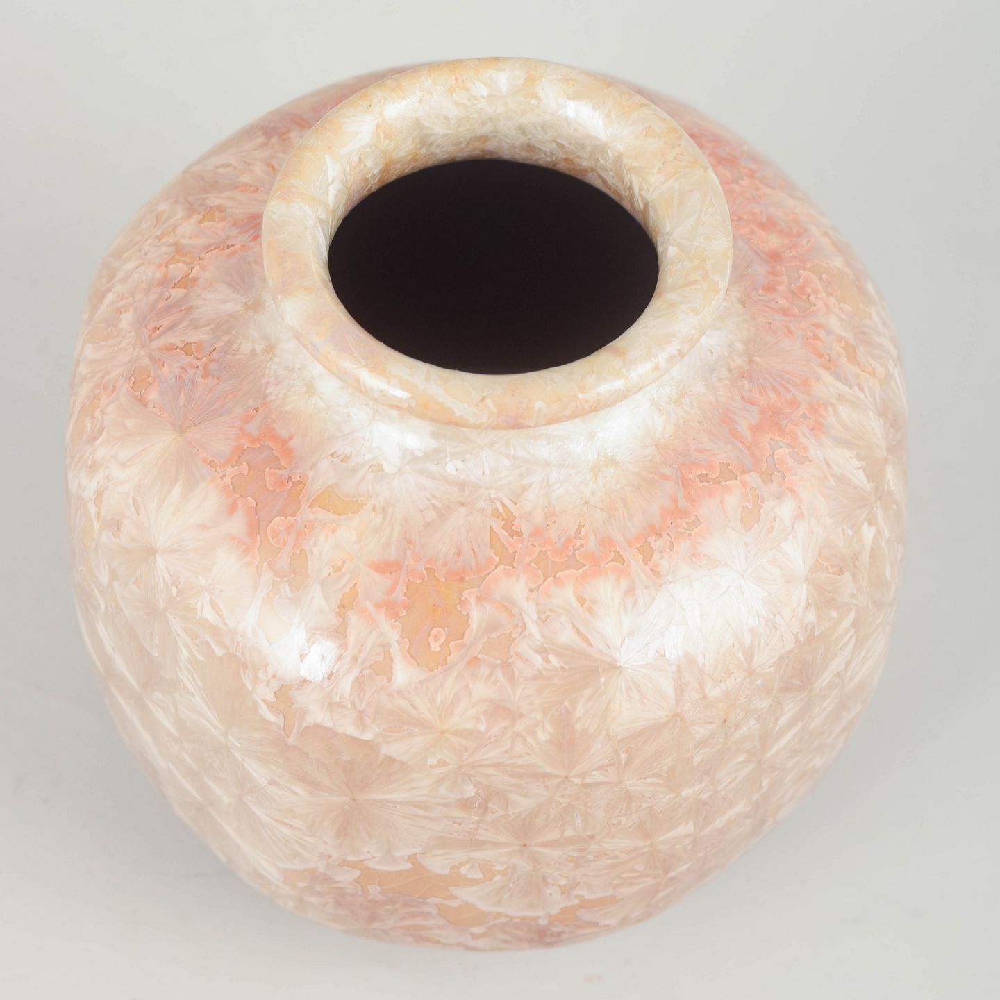 Small, compact art-ceramic vase with a characteristic crystalline glaze in soft pink, cream and pearlescent tones. The faceted, crystal-grown surface creates a lively play of light and depth – a hallmark of German ceramics from this period.