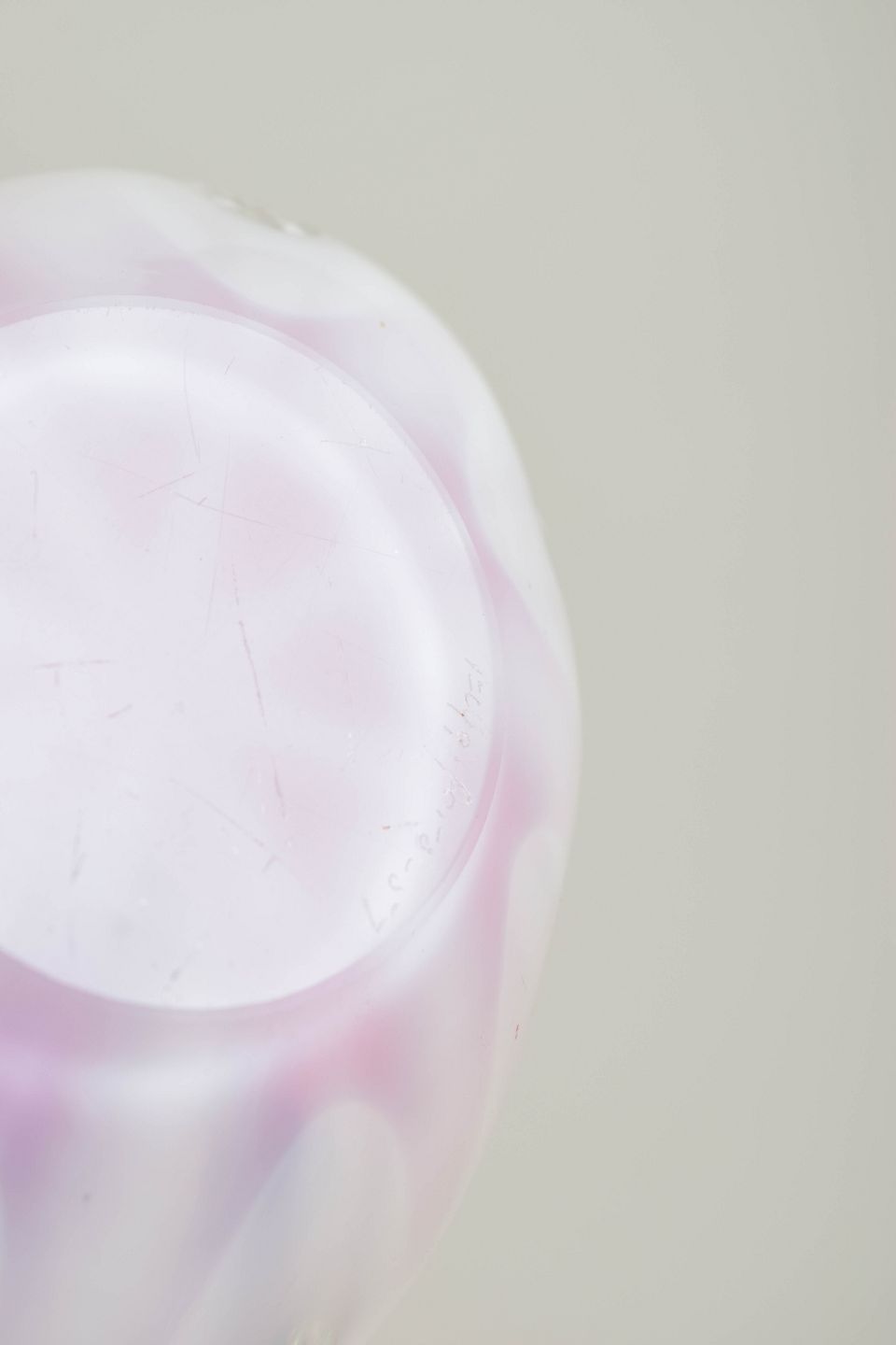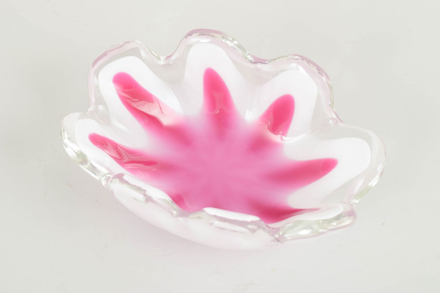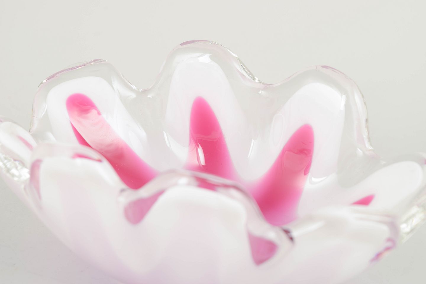 Decorative “Coquille” bowl in layered art glass with pink interior colouration, a white middle layer, and clear outer casing. The wavy, flower-like shape represents one of Kedelv’s more sculptural variations within the series.