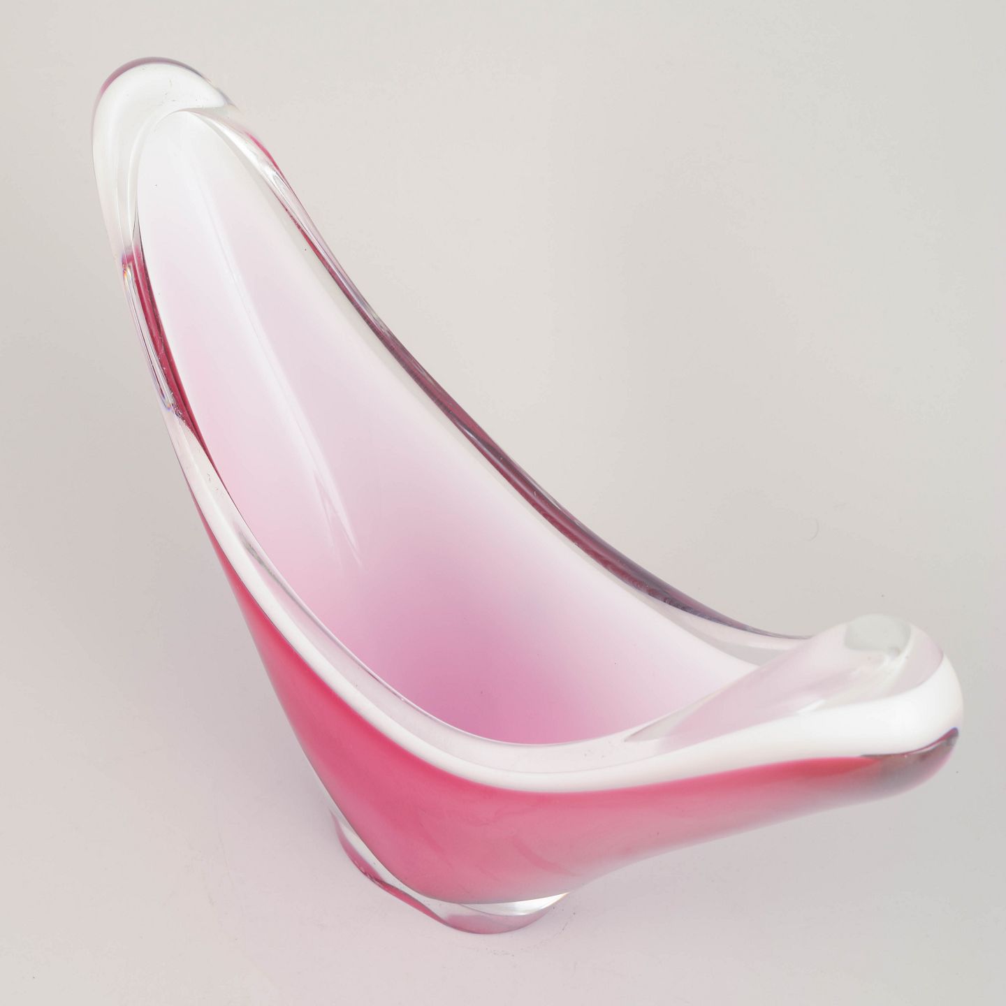 Impressive “Coquille” bowl in layered art glass with deep pink colouring encased in clear glass. The broad, sweeping V-shape is characteristic of Kedelv’s most iconic late-1950s designs.