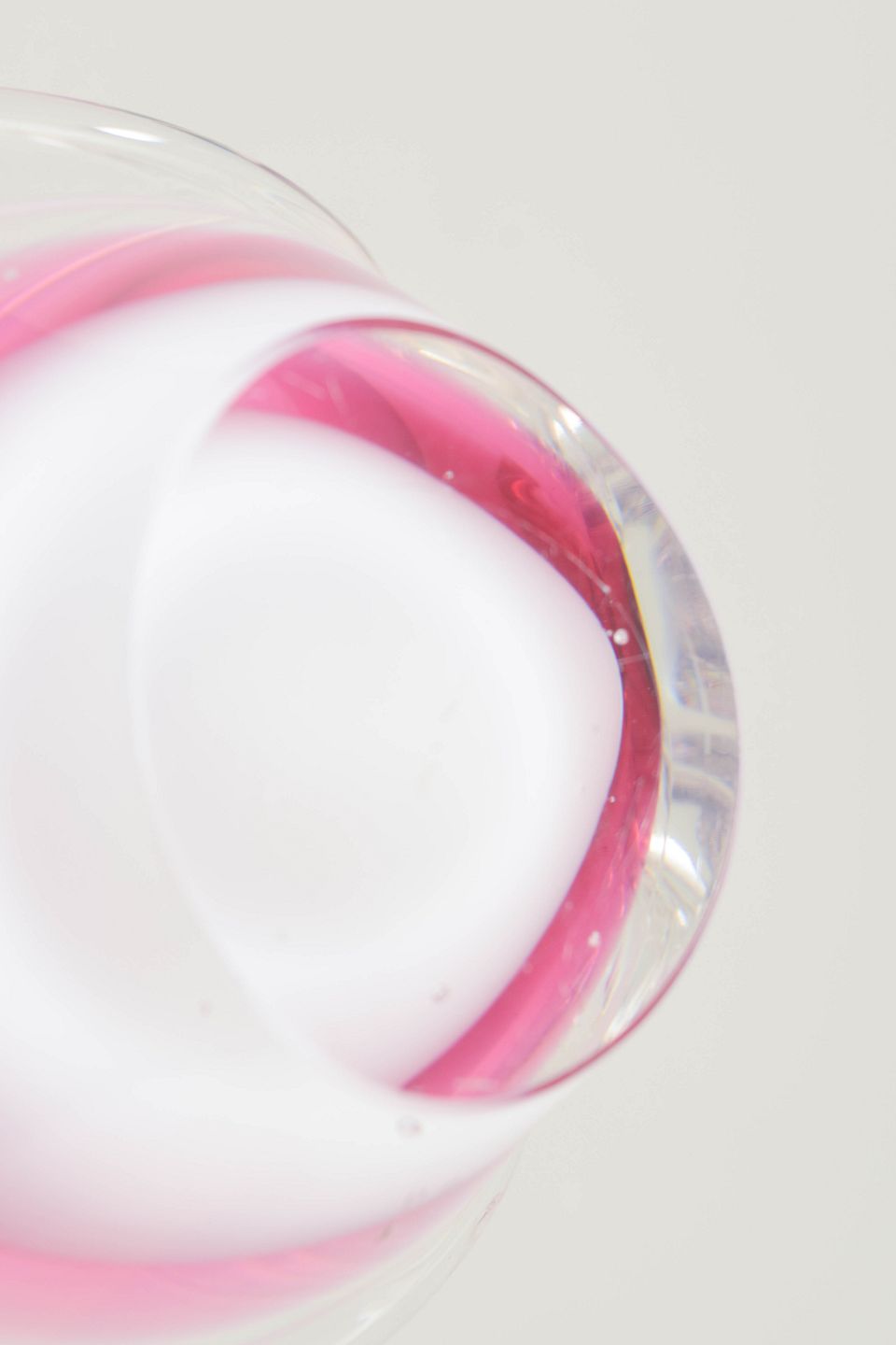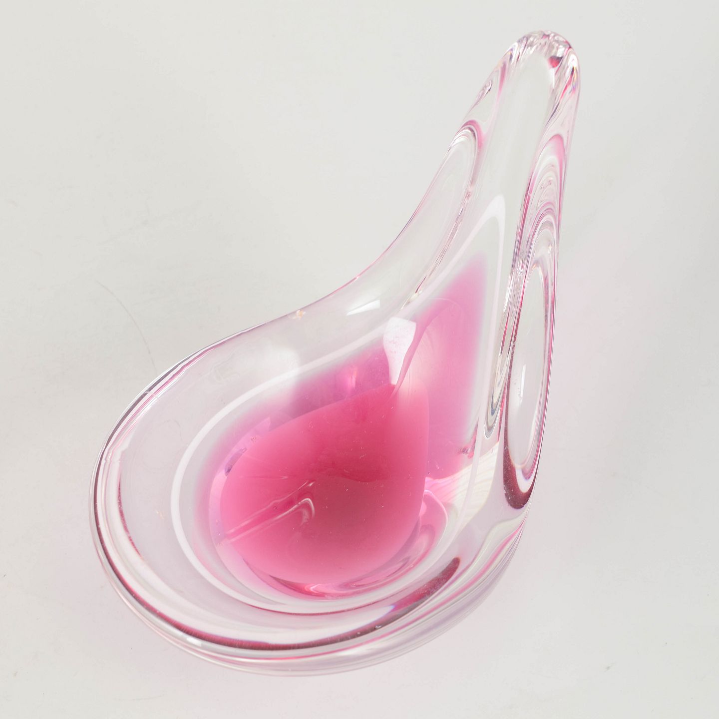 Elegant “Coquille” bowl in layered art glass with pink colouring encased in clear glass, featuring the characteristic asymmetrical, upward-curving form typical of Kedelv’s organic glass design.
