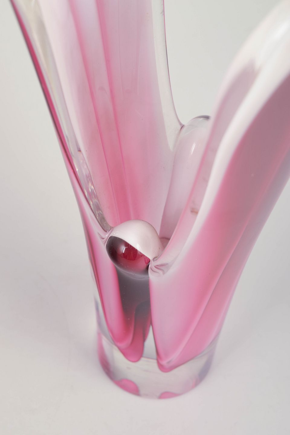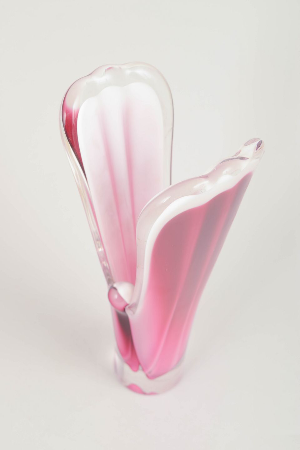 Sculptural “Coquille” vase in clear glass with inner layers of pink and white, characteristic of Kedelv’s organic design language at Flygfors.