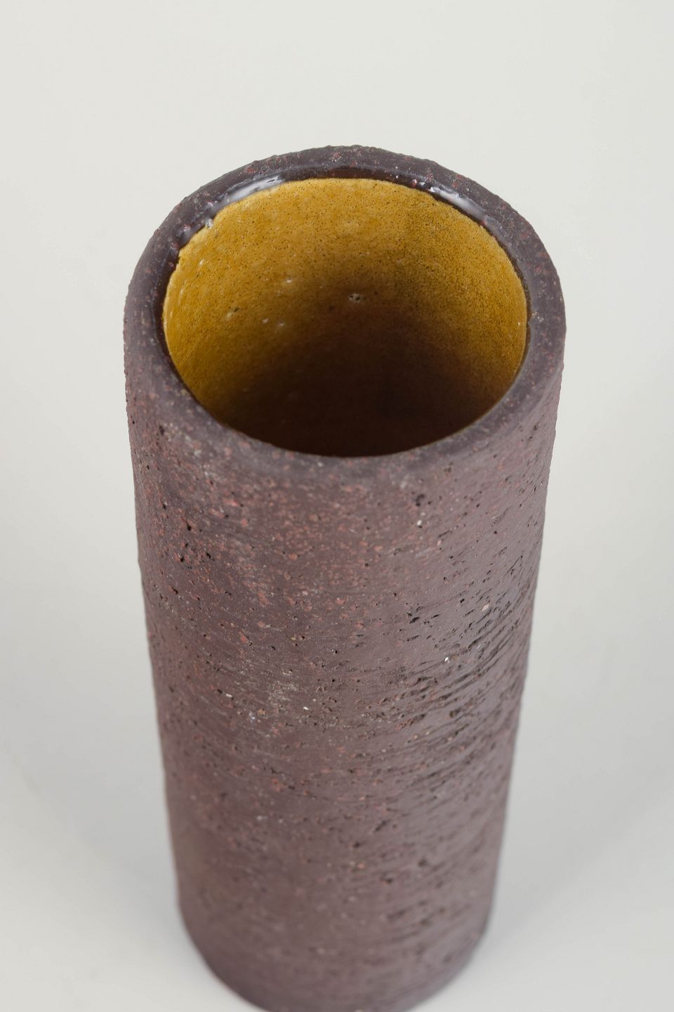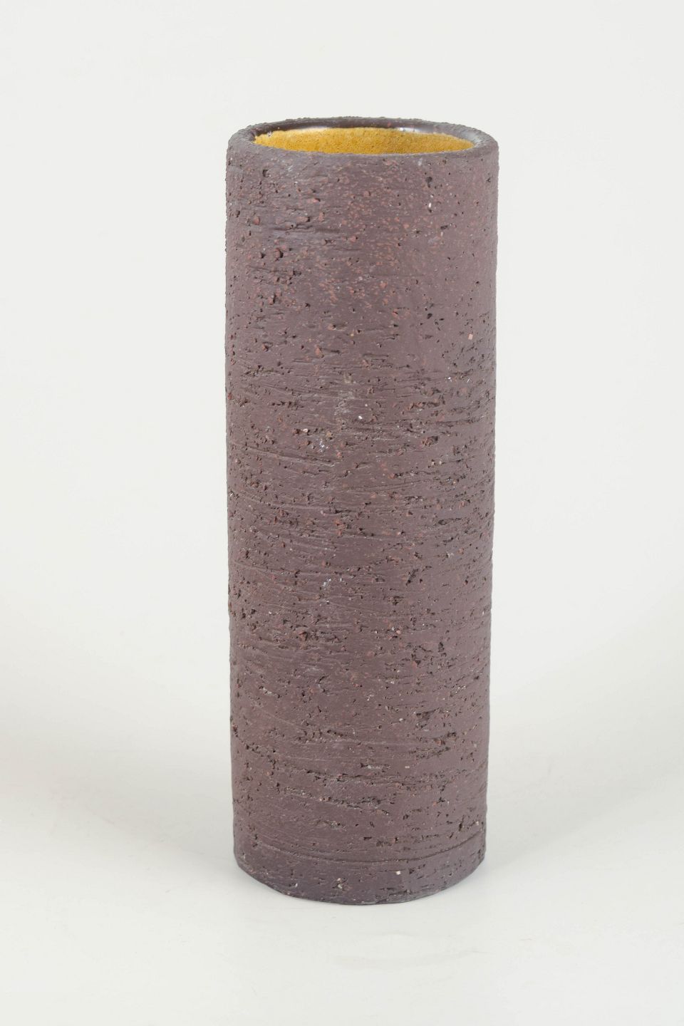 Cylindrical vase in characteristic chamotte stoneware with a raw, textured brown exterior and contrasting yellow glaze inside. A fine example of Nylund’s material-driven aesthetic from this period.