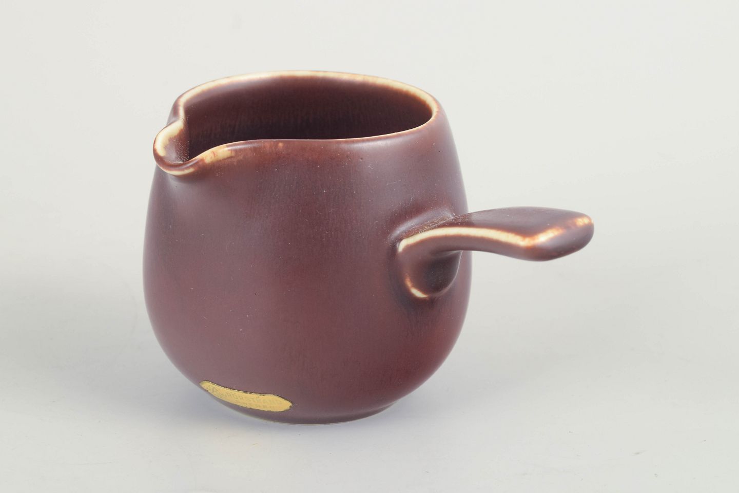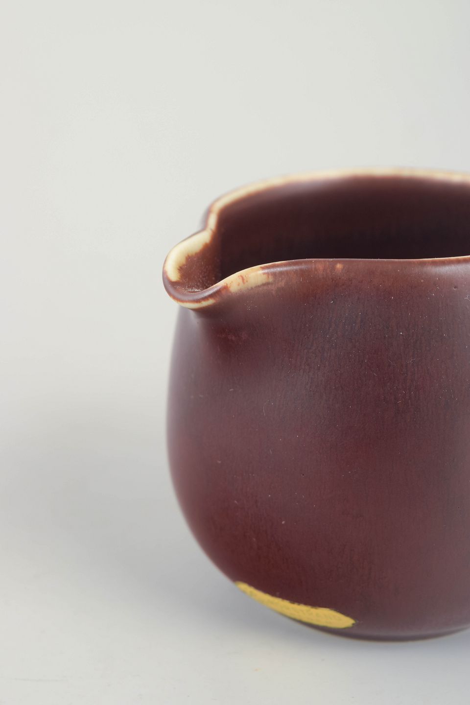 Elegant small creamer in a warm reddish-brown matte glaze with a rounded body and distinctive side handle—hallmarks of Nylund’s sculptural yet functional design. The soft glaze transitions and organic lines give the piece a refined modernist character.