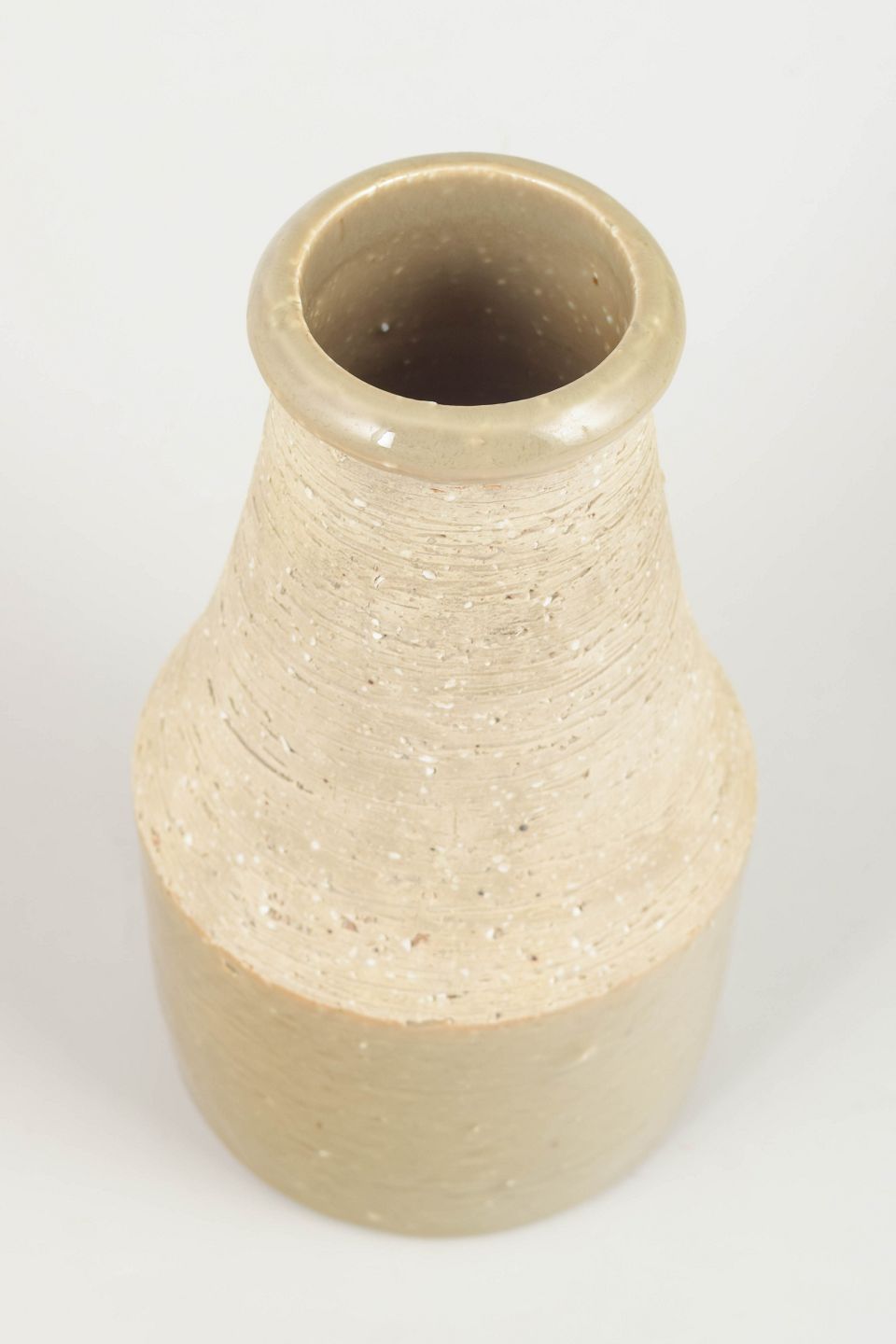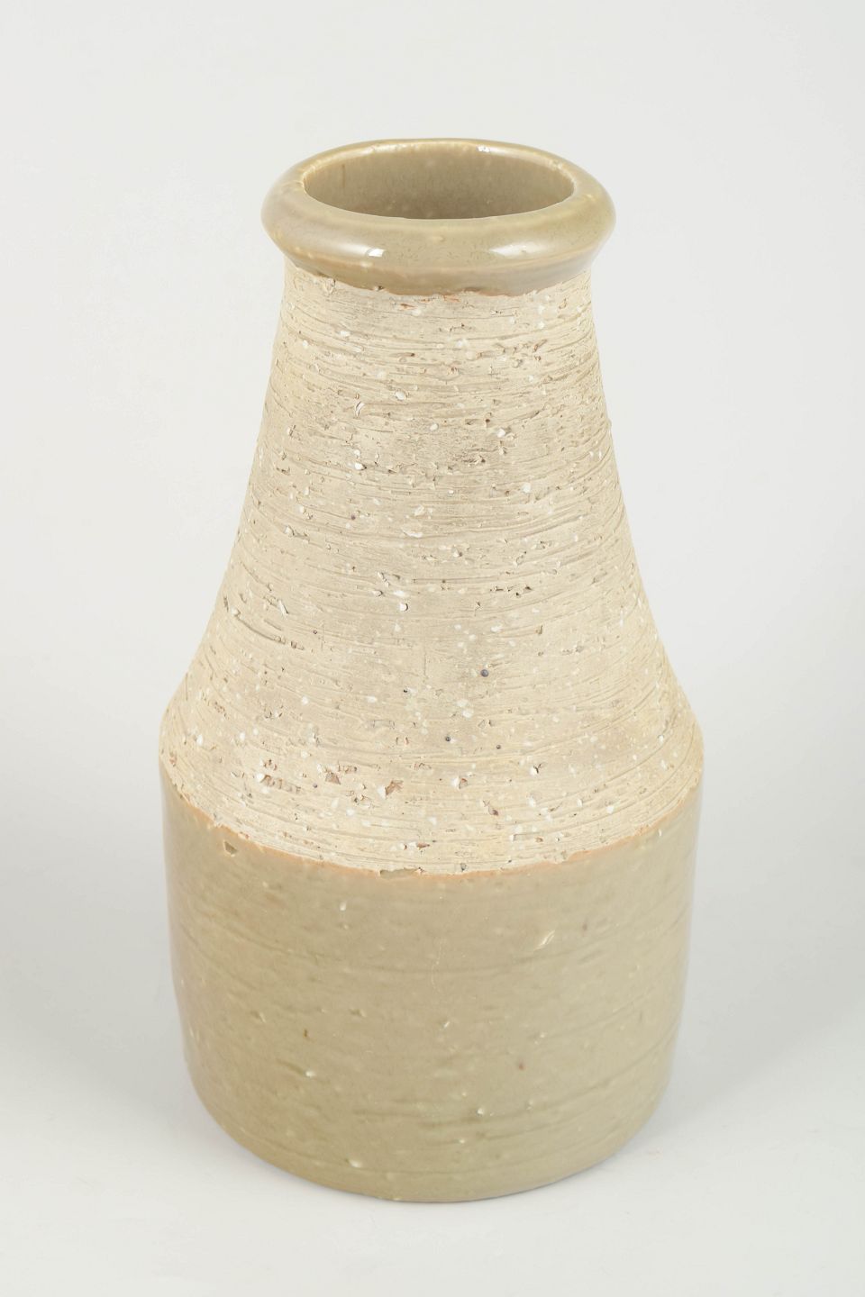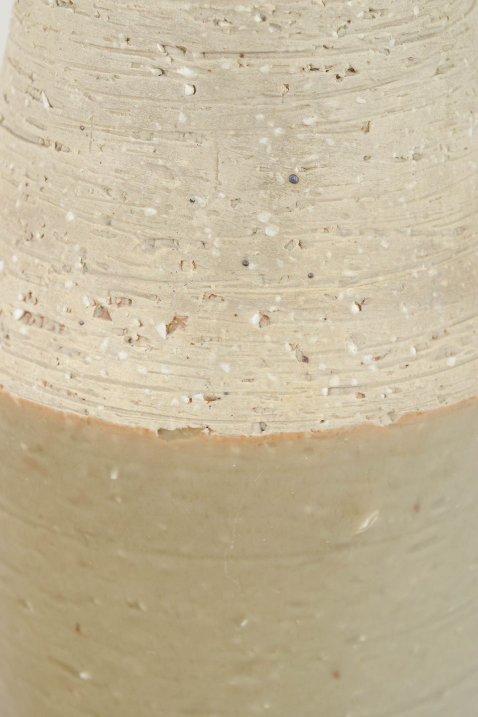 Cylindrical stoneware vase combining glazed and unglazed surfaces. The upper section features a raw, textured finish, while the lower part is glazed in a light beige/greenish tone.