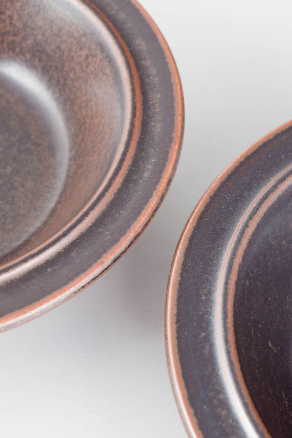 Two deep dishes in dark brown stoneware from Arabia’s iconic “Ruska” series, known for its robust chamotte body and distinctive matte iron-brown glaze with natural variation.