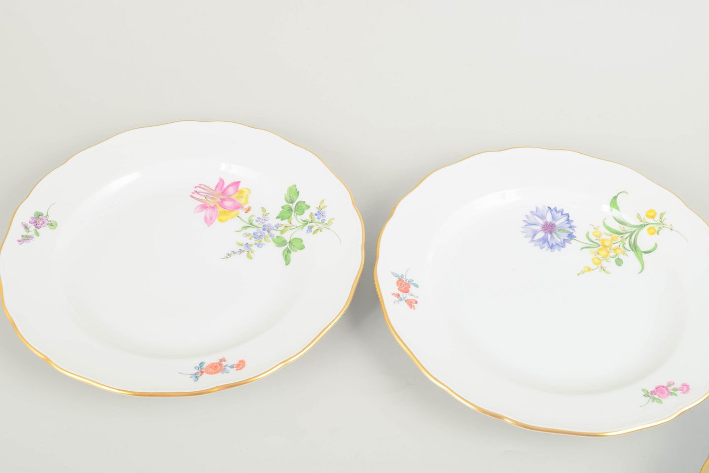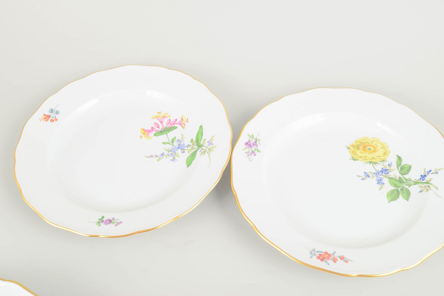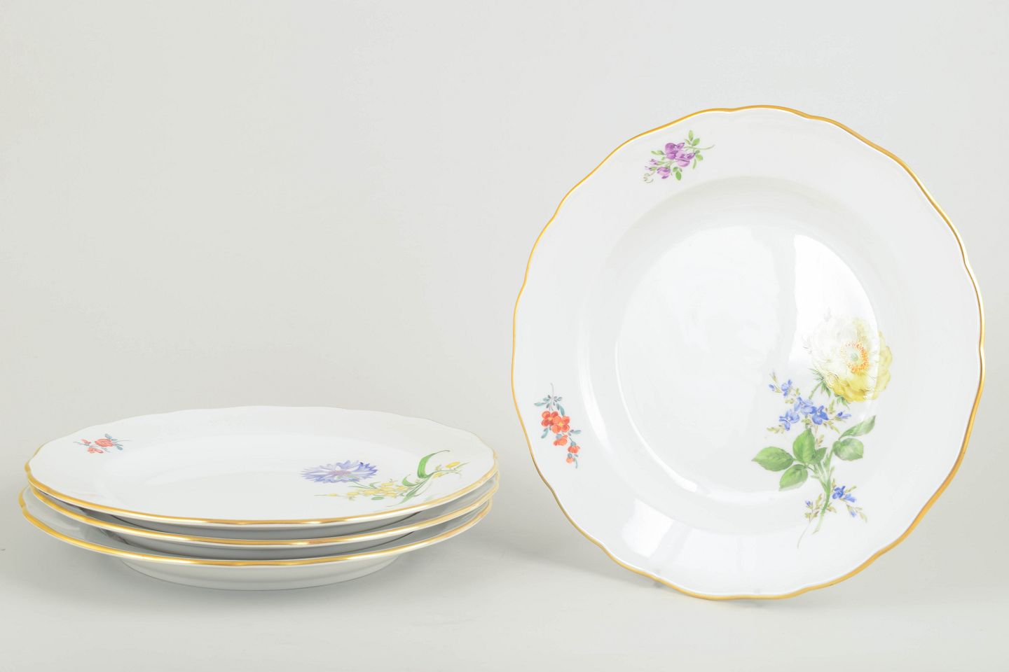 Four antique Meissen porcelain plates with hand-painted floral decorations and gilt rims. Classic scalloped edge with finely executed polychrome bouquets, typical of Meissen’s refined craftsmanship.