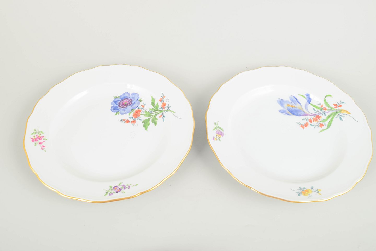 Four antique Meissen porcelain plates with hand-painted floral decorations and gilt rims. Classic scalloped edge with finely executed polychrome bouquets, typical of Meissen’s refined craftsmanship.