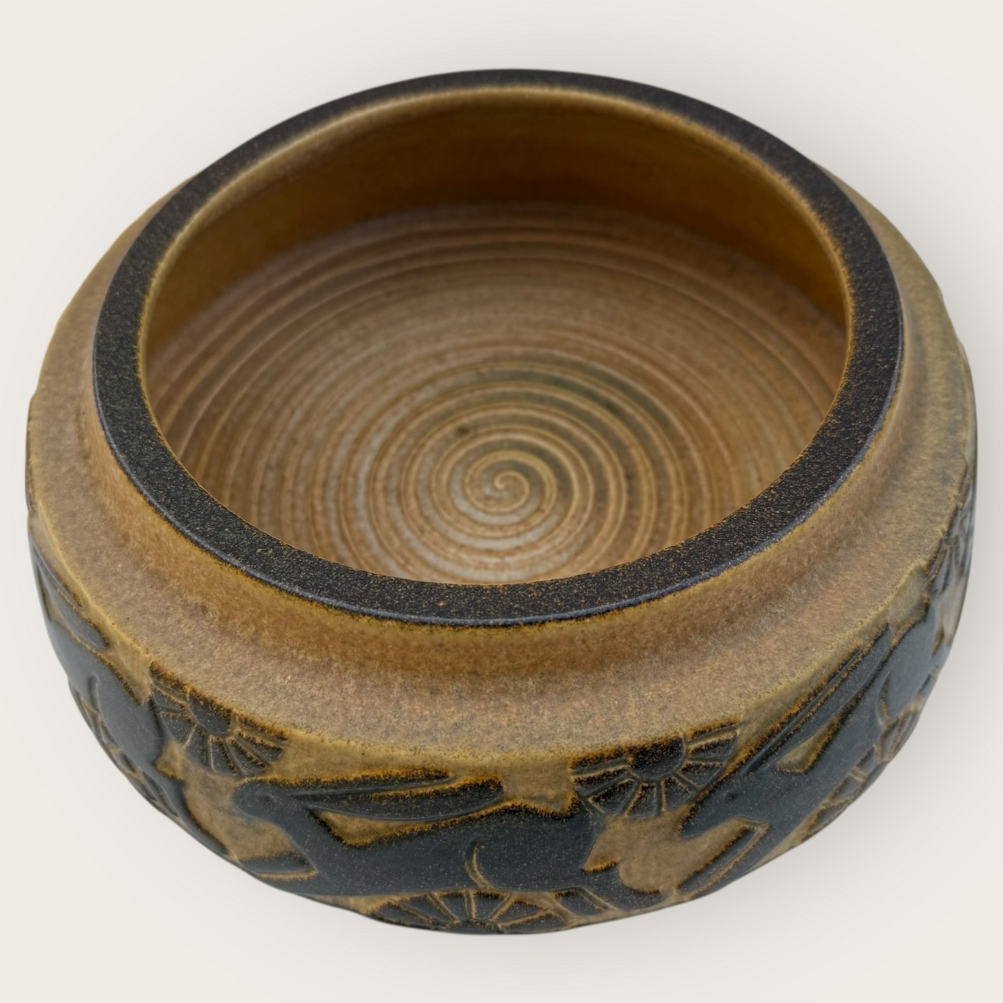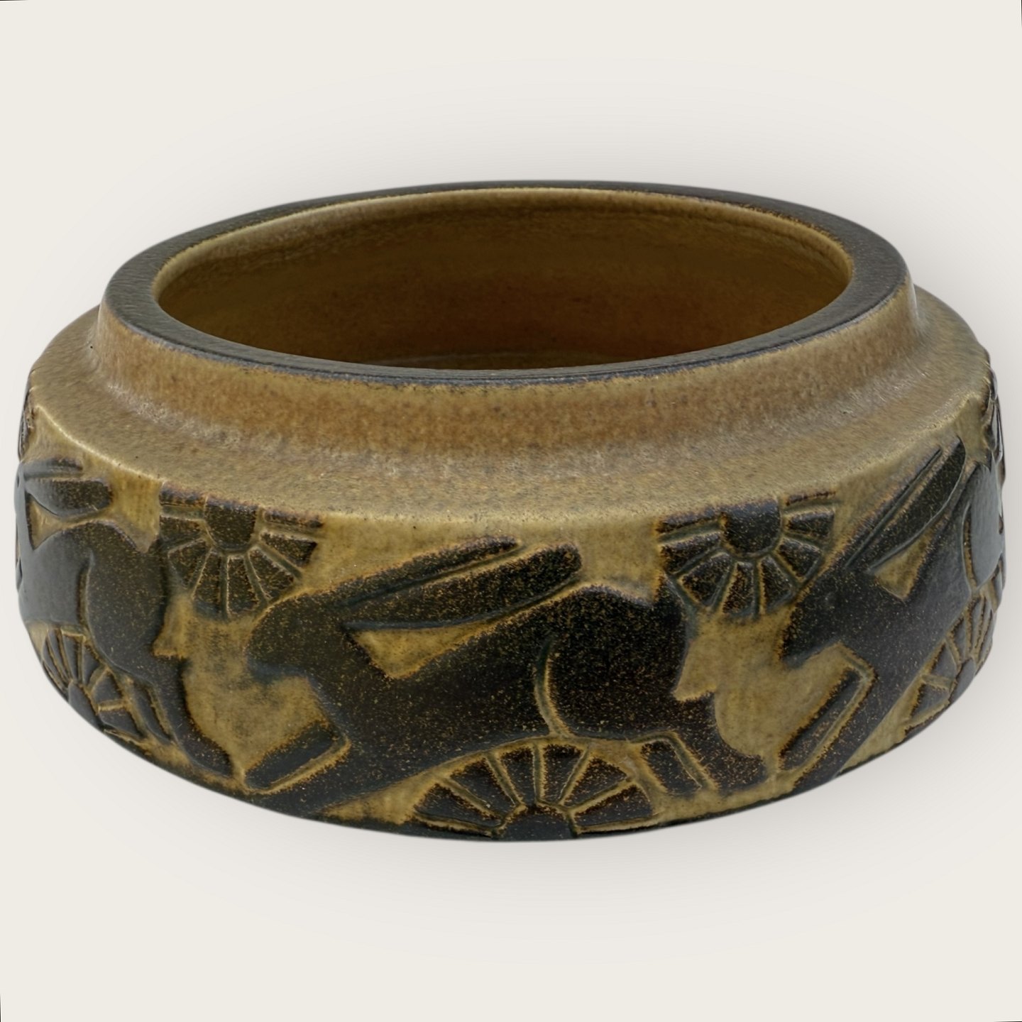 Bornholm pottery, Michael Andersen, Large Bowl with jumping hares, diameter 23.5cm, height 8cm, # L429 *Good condition*Stock: 1