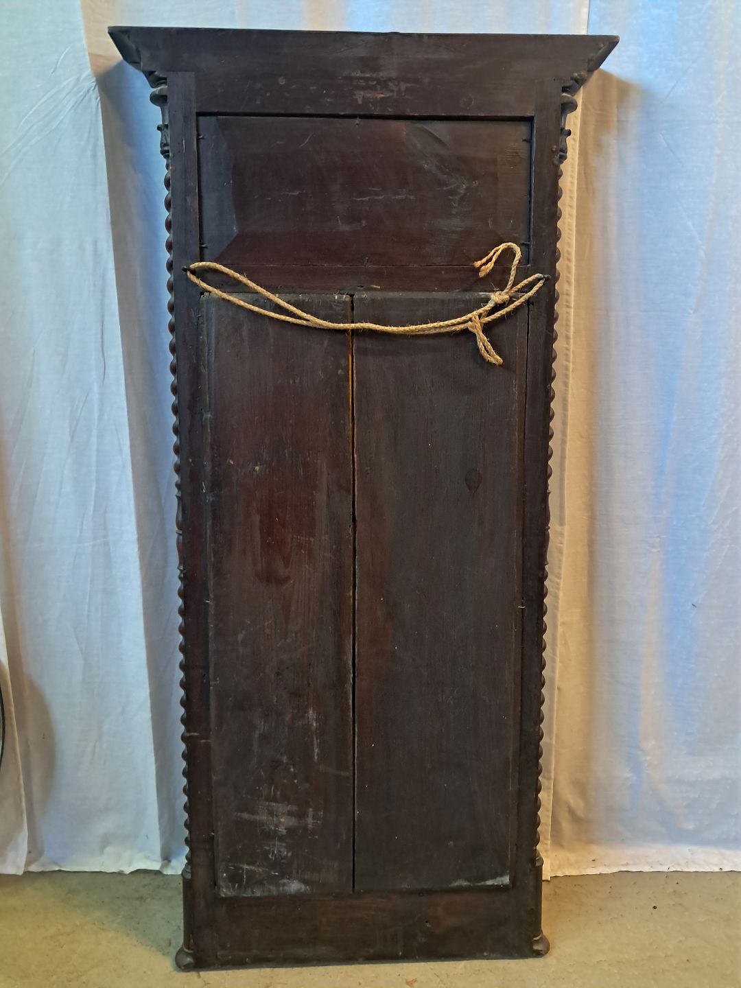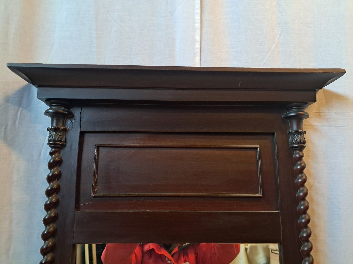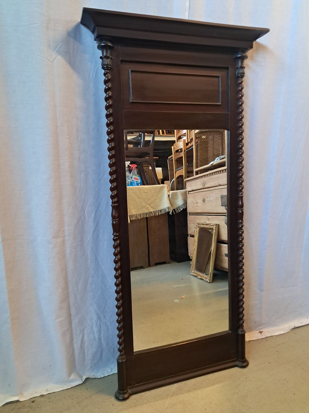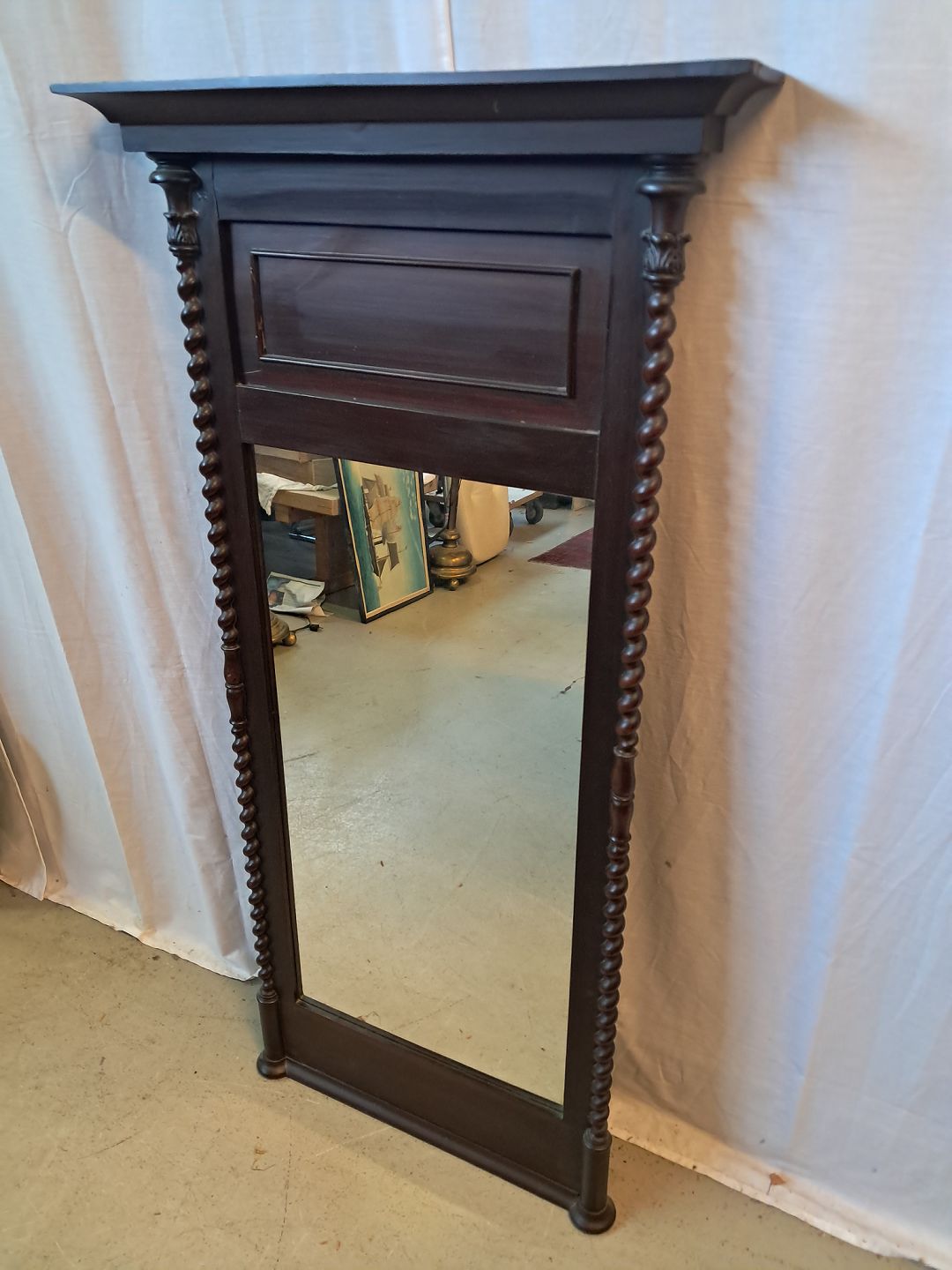 Spejl i fineret mahogni, fra 1900erne.Det har brugsspor.