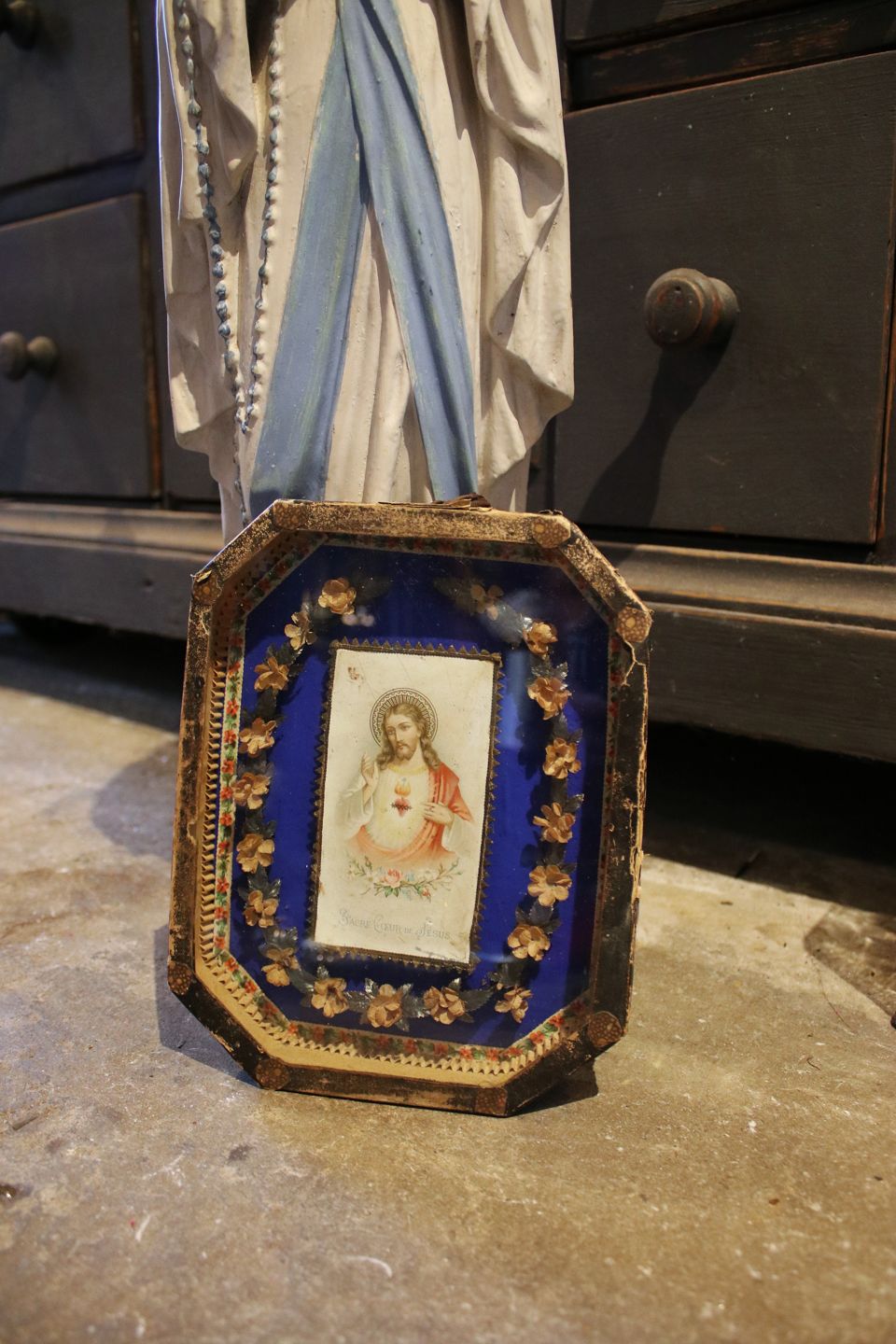 Decorative, old religious picture (with glass) with Jesus pictureand fine flower wreath in fabric.