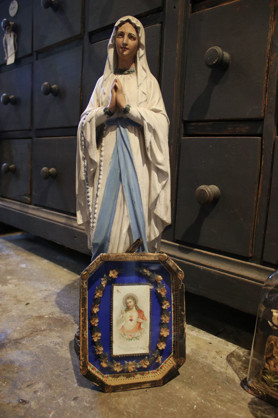 We offer a wide selection of old furniture with character, prism chandeliers and French church candlesticks.