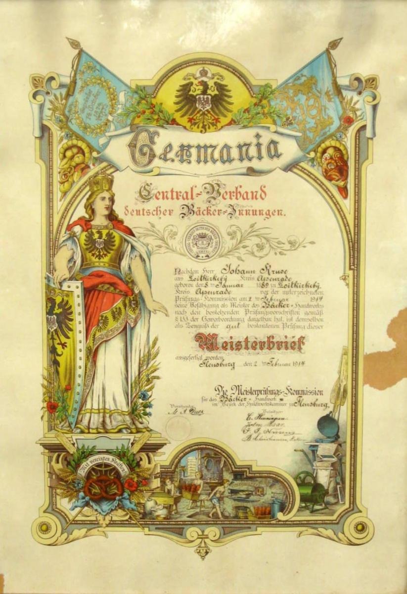 Master baker letter Løjt Kirkeby 1914. Master baker Johan Kruse. Lithography. 66 x 48 cm. In mahogany frame.Item number: 6260