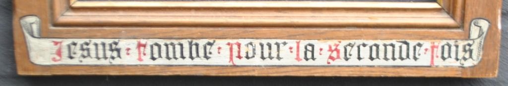 Religious frame in oak, 19th century. Denmark. With French text: Jesus rombe pour la seconde Fois. (Jesus falls for the second time). Above cross and Roman numerals: X. 58 x 46 cm.Provenance: A monastery on Zealand.
