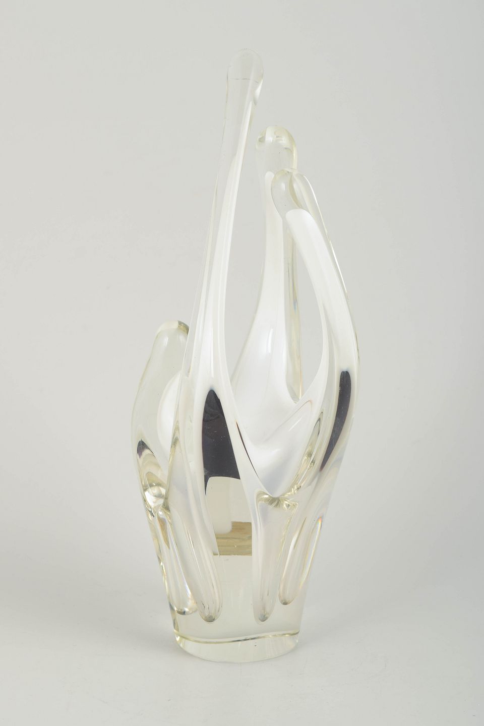 Organic, sculptural art-glass vase in clear glass with an inner white core, mouth-blown in the characteristic upward-flowing Coquille form. An elegant early example from the mid-1950s.
