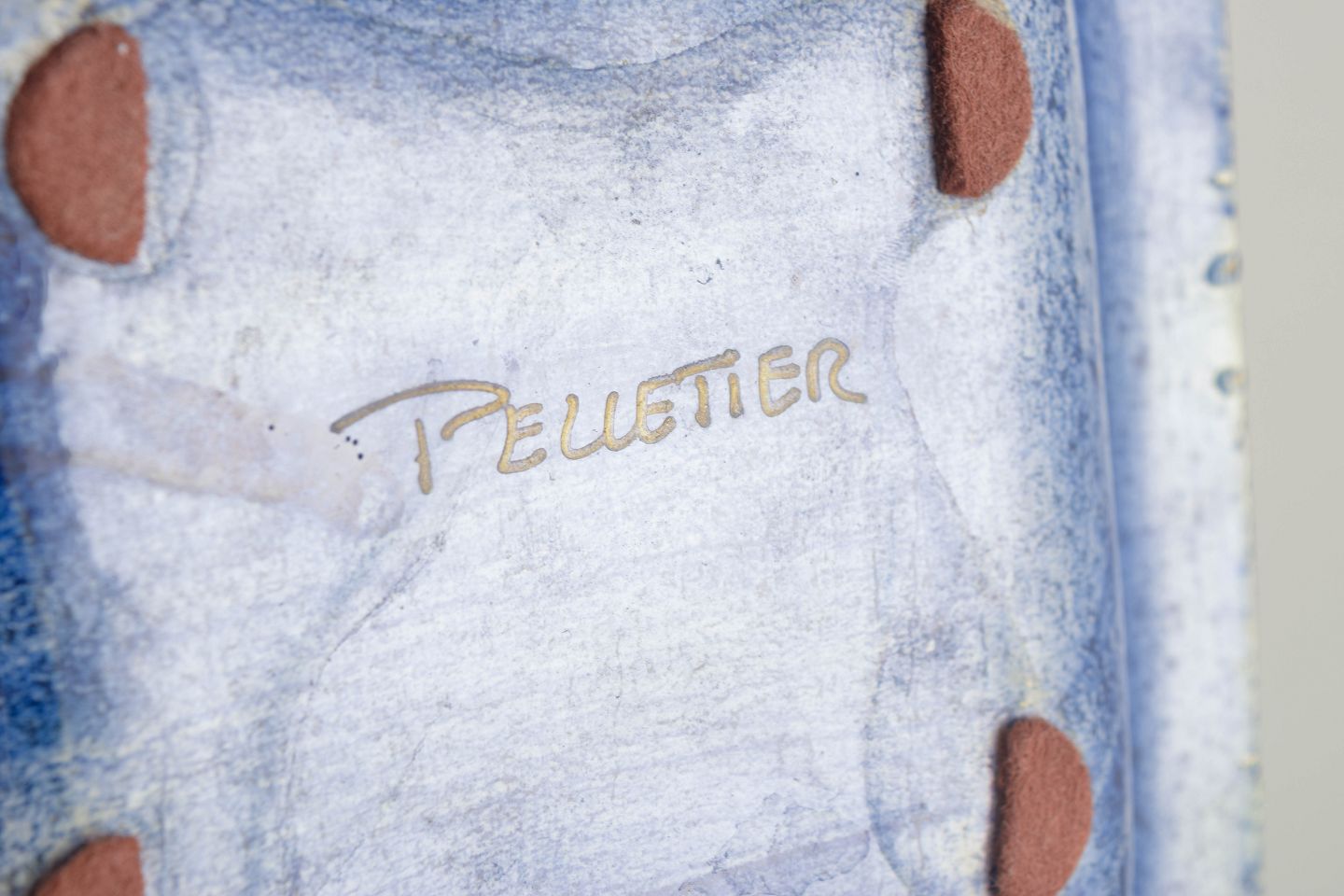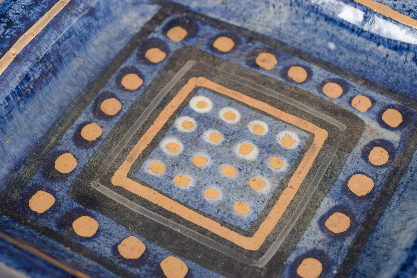 Rectangular, low ceramic dish with Pelletier’s characteristic geometric decoration in blue, ochre and white.