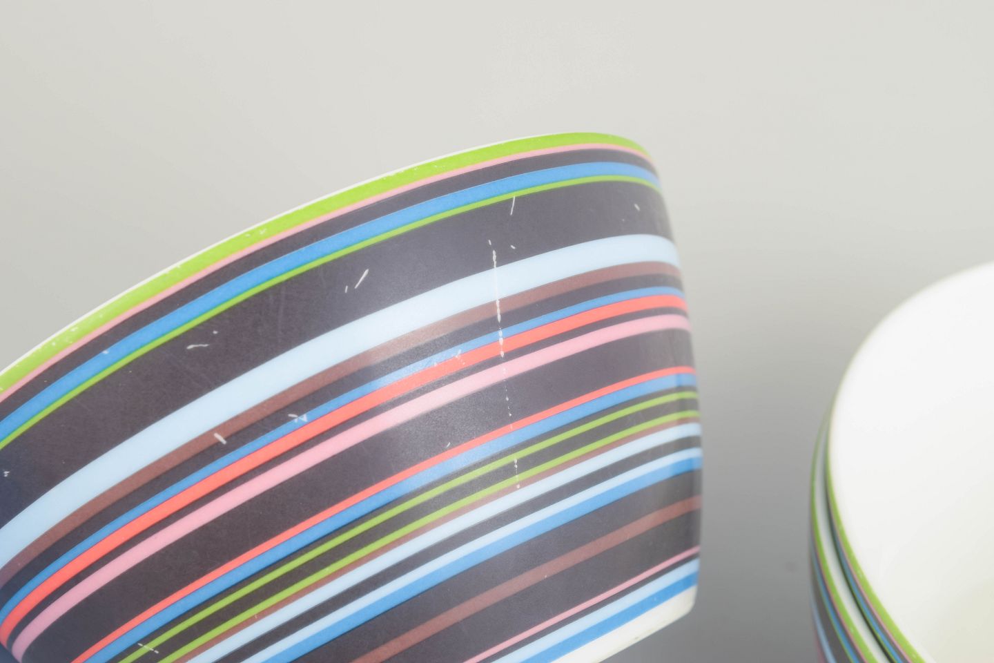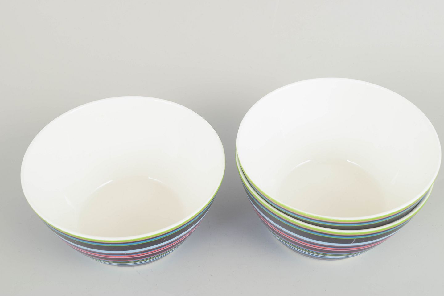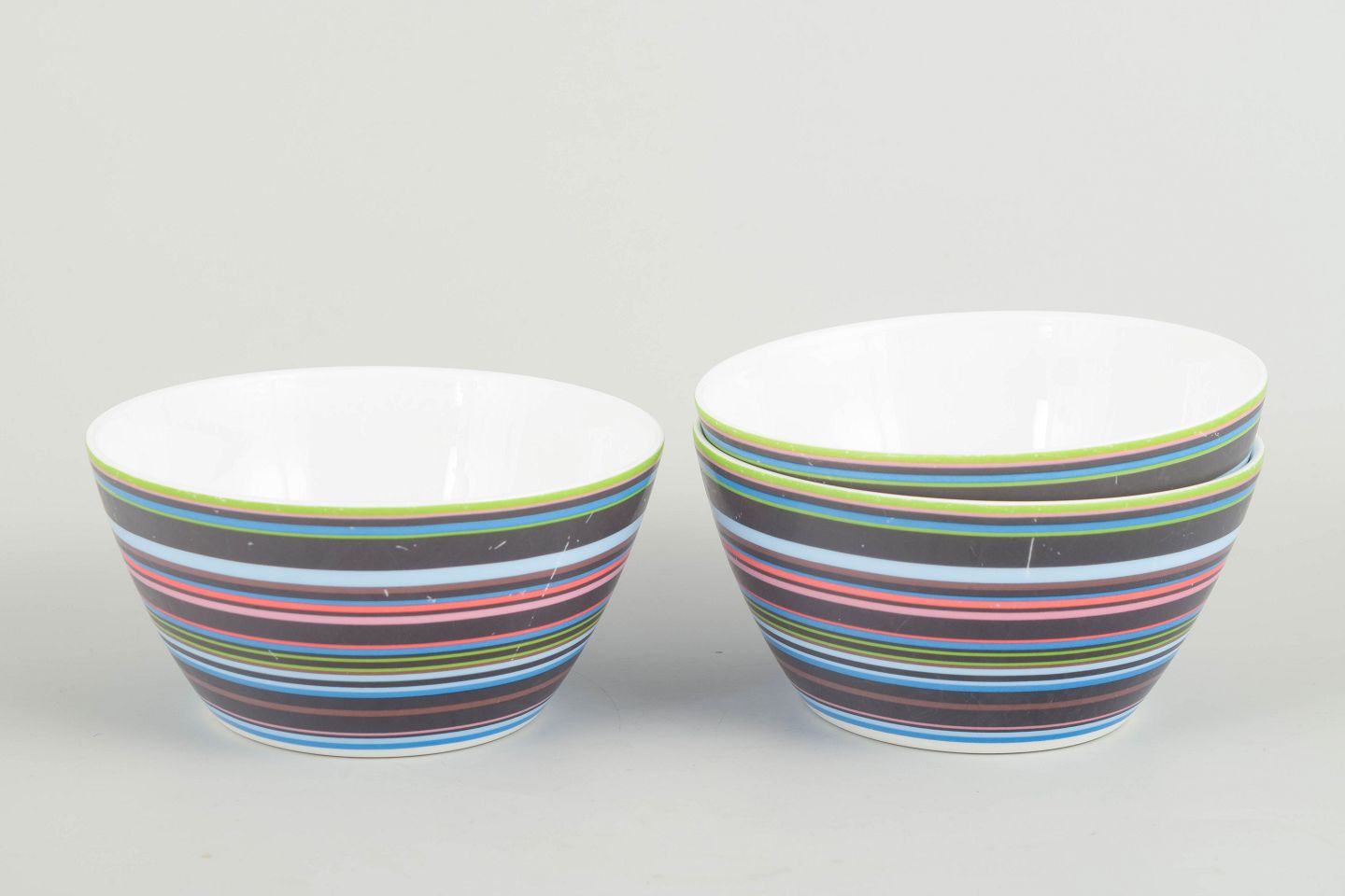 Three colourful porcelain bowls from the iconic Origo series, decorated with the characteristic multicoloured horizontal stripes.