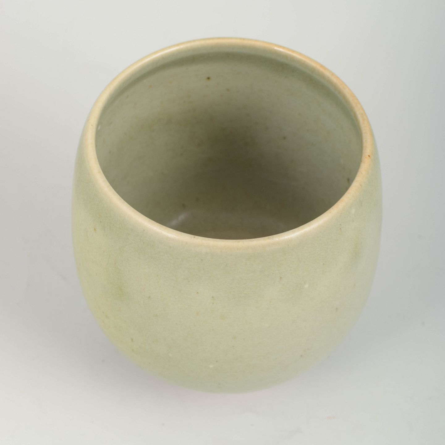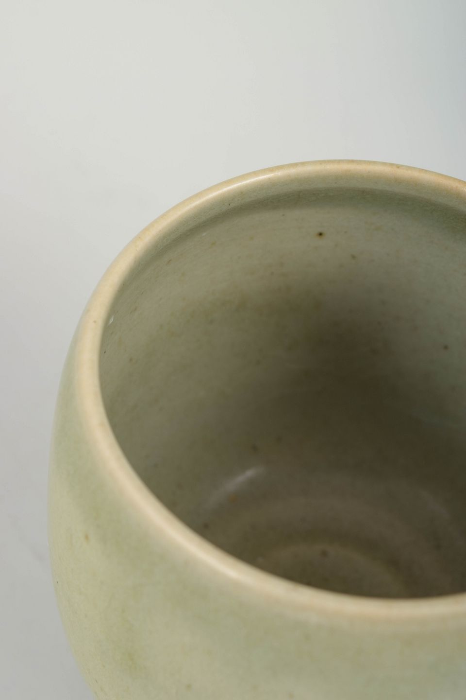 Rolf Palm, Mölle, Sweden – Vase, 1980/90s.Beautiful hand-thrown unique stoneware vase with a softly rounded form, finished in a subdued, green-tinged celadon glaze with a smooth, even surface. The warm terracotta tone at the foot creates a subtle contrast, characteristic of Palm’s simple and material-focused expression. An elegant example of his more minimal studio work from the period.