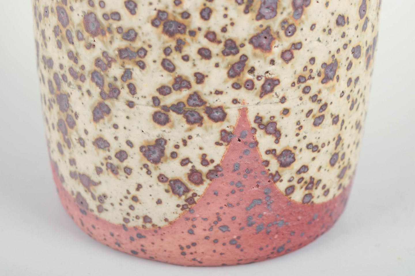 Rolf Palm, Mölle – Large unique vase, 1960/70sImpressive hand-thrown stoneware vase by Rolf Palm, produced in his studio in Mölle. Cylindrical shape with a slightly tapered neck and a distinctive, heavily textured surface. The glaze is typical of Palm: a volcanic, tactile expression in cream, red and brown tones.