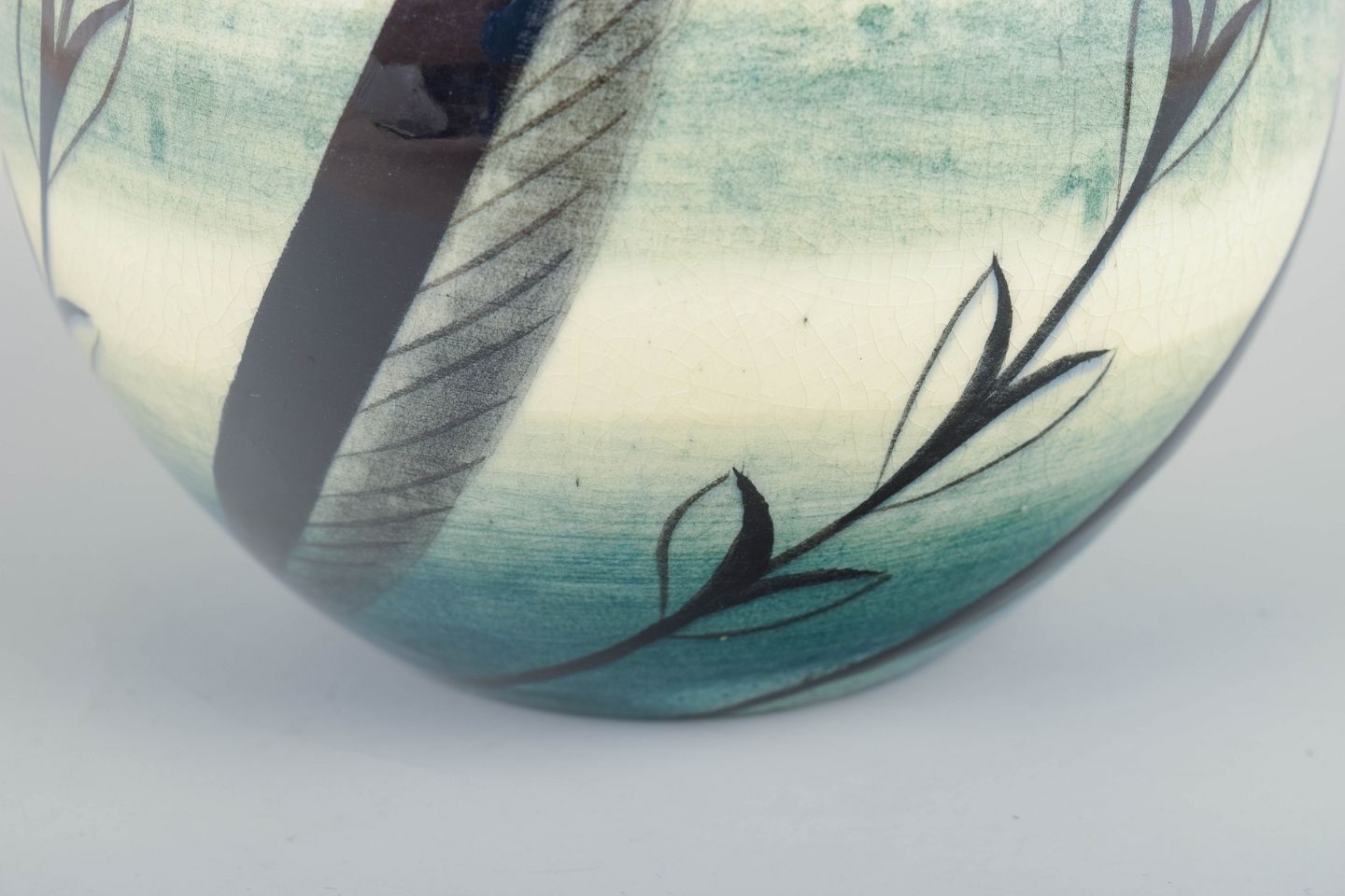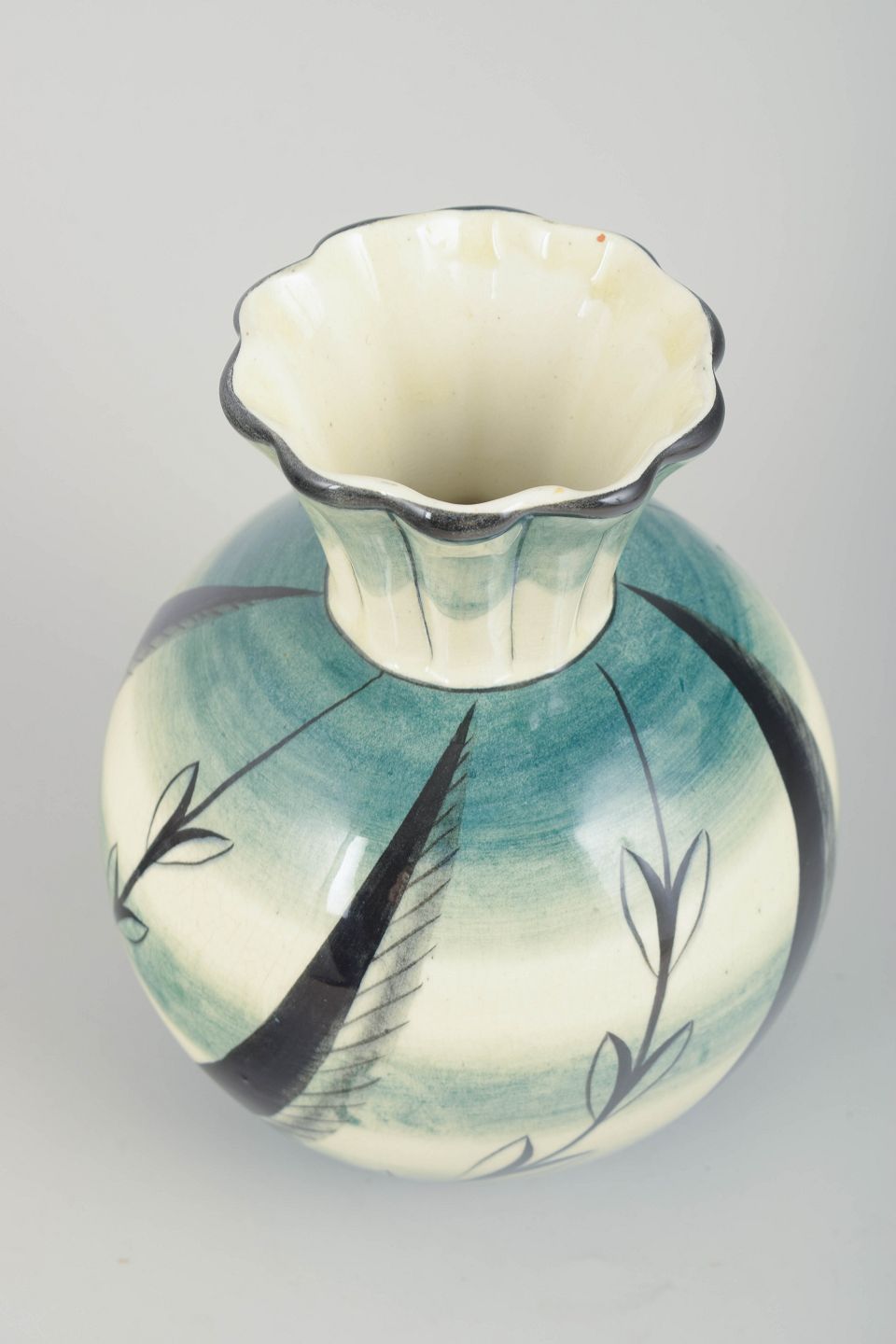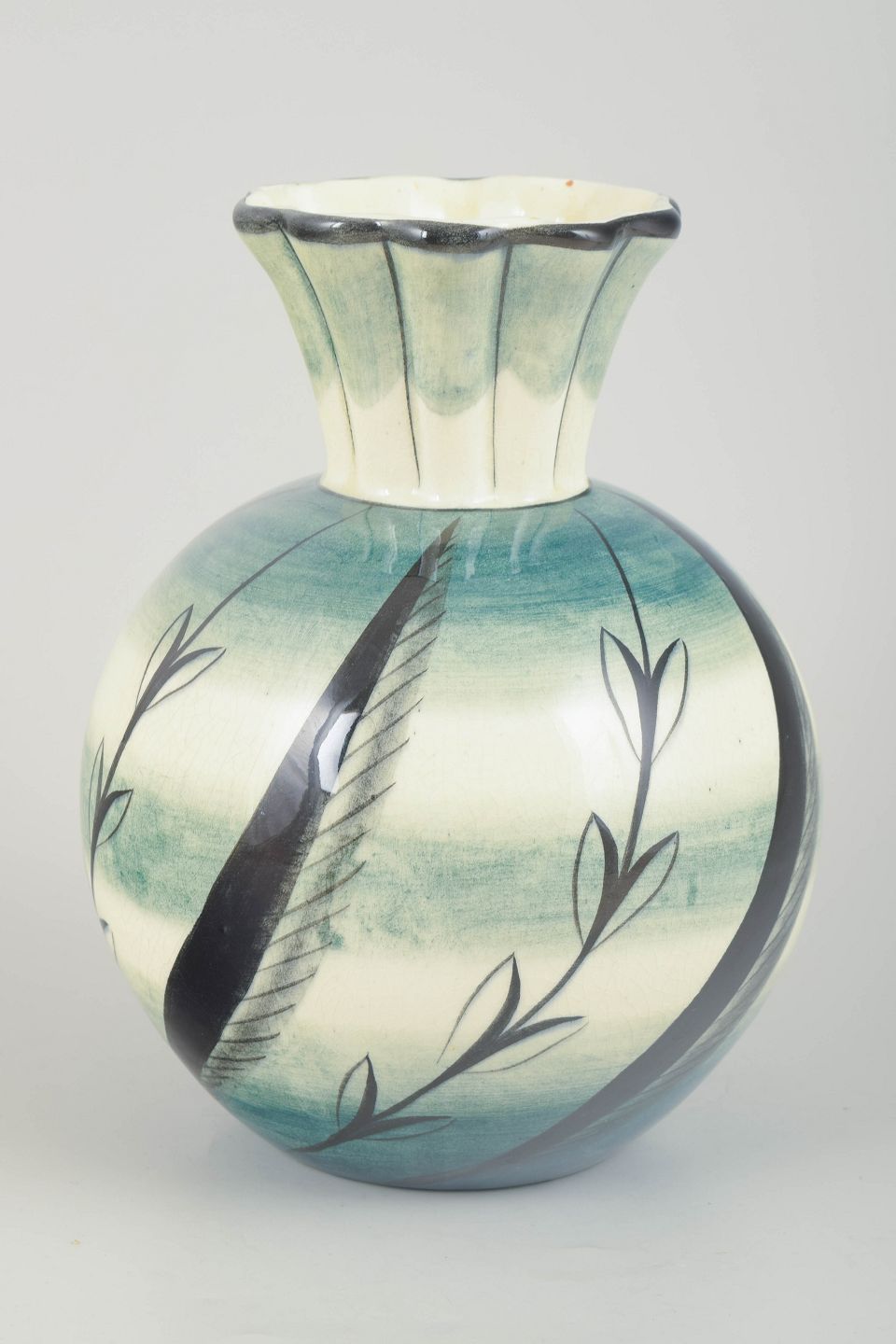 Art Deco-inspired vase in glazed faience with hand-painted decoration in blue, green, and black tones. The rounded body and fluted, flared neck highlight the decorative aesthetics of the period.